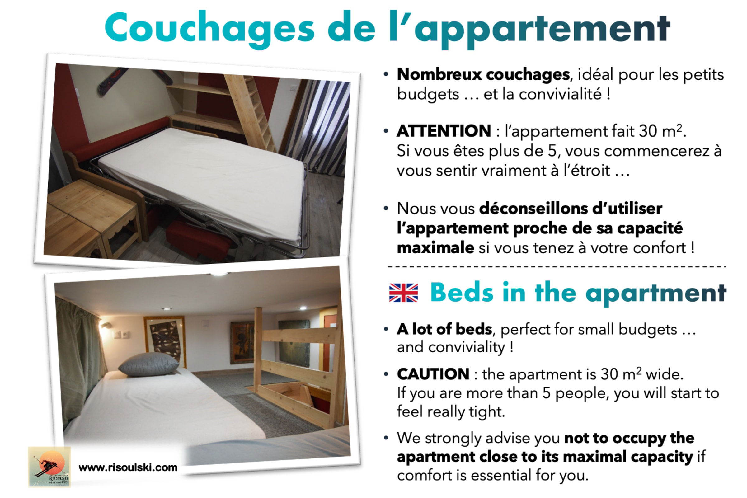 Die Unterkünfte sind praktisch und komfortabel gestaltet. Der Raum wurde optimiert, um viele Betten, aber auch viel Stauraum unterzubringen. RisoulSki bietet Familien oder Freundesgruppen die Möglichkeit, in einem einzigen Apartment zusammenzukommen, sei es aus gemeinsamem Wunsch oder aus finanziellen Gründen.