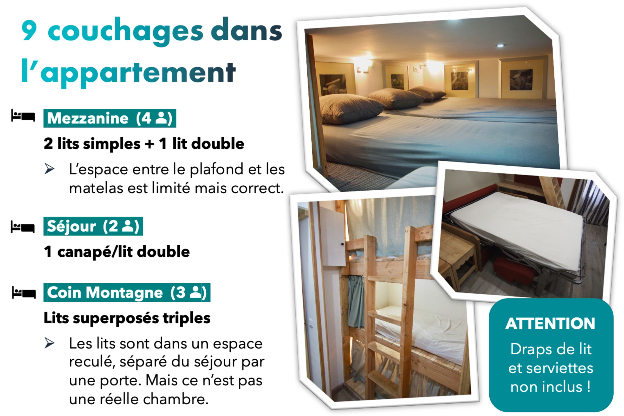- Entweder Sie mieten eines über RisoulSki: 11 €/Einzelbett-Set; 14 €/Doppelbett-Set; 5 €/großes Handtuch; 8 €/Set Handtücher (ein großes und zwei kleine)