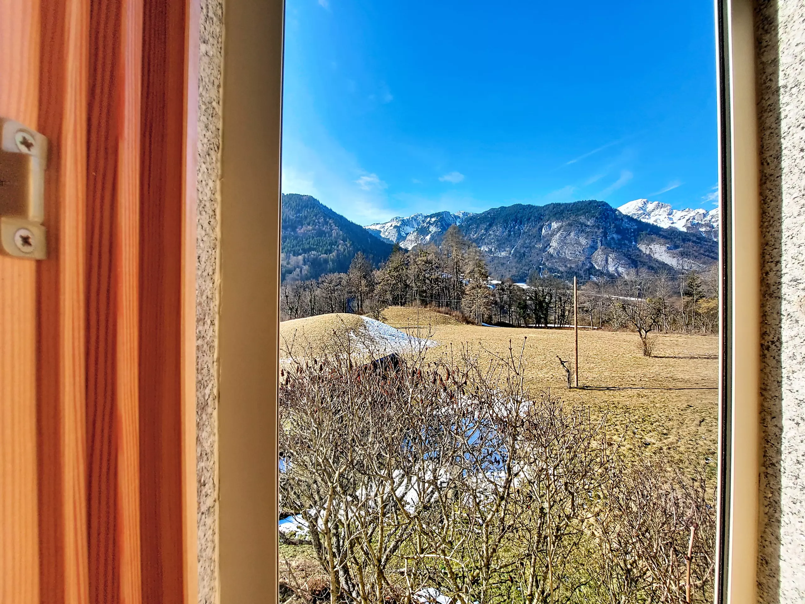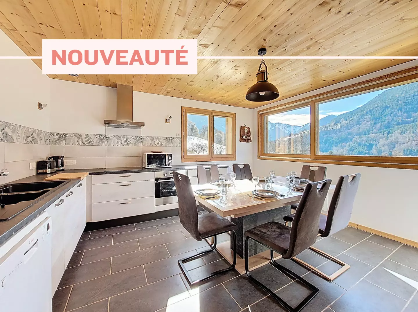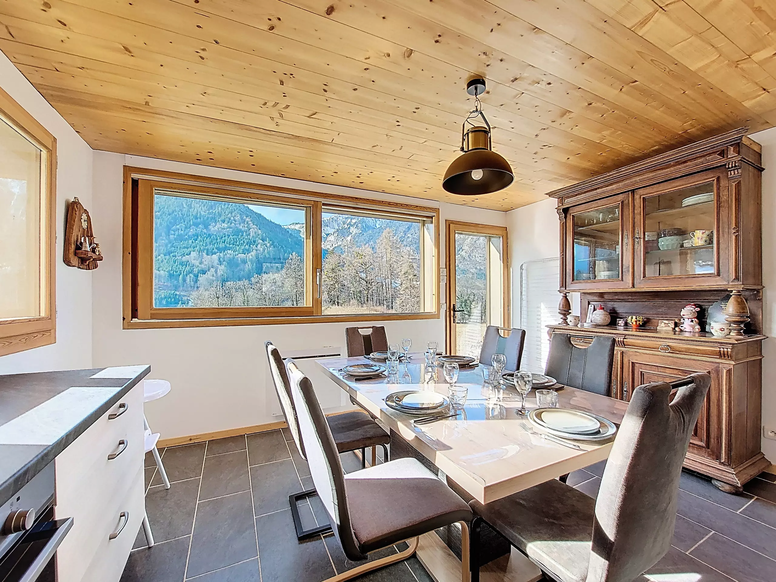- Essbereich: ein großer, geselliger Tisch mit sechs Stühlen in einem hellen Raum mit herrlichem, unverbautem Blick auf die Berge.