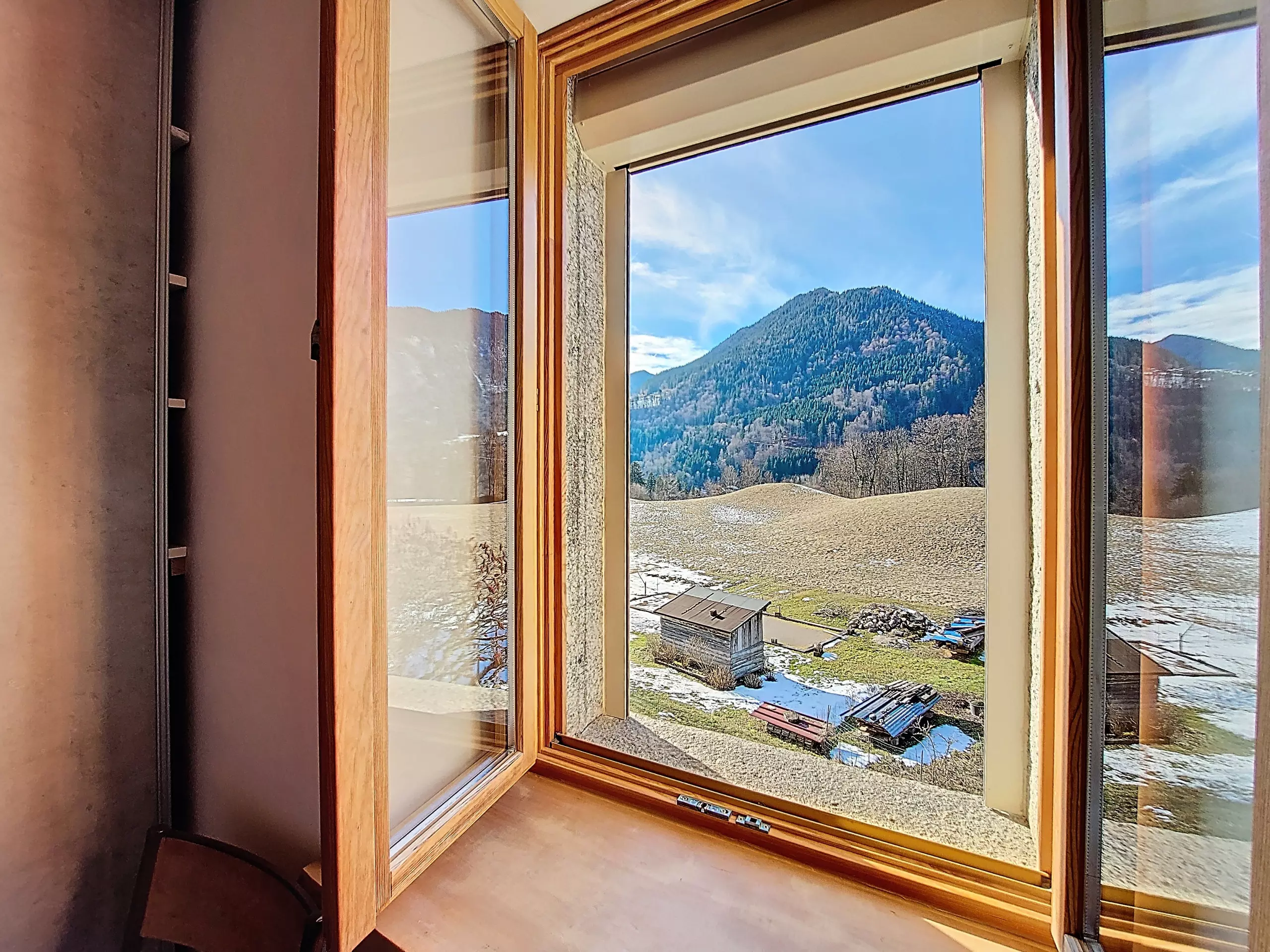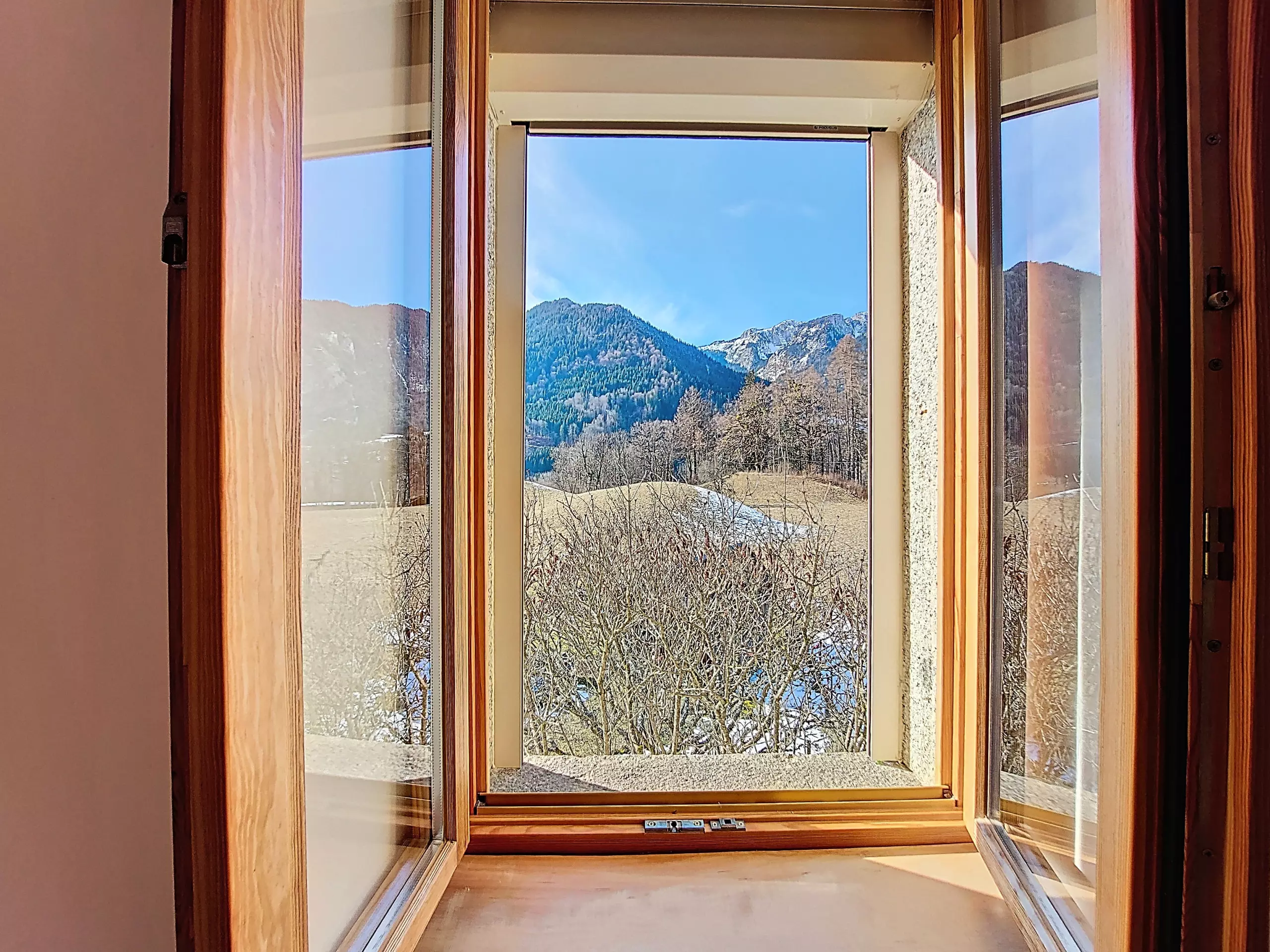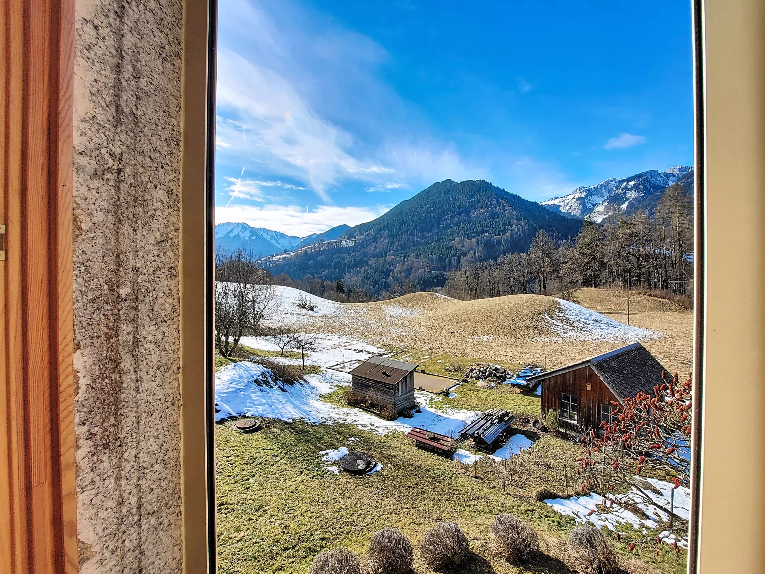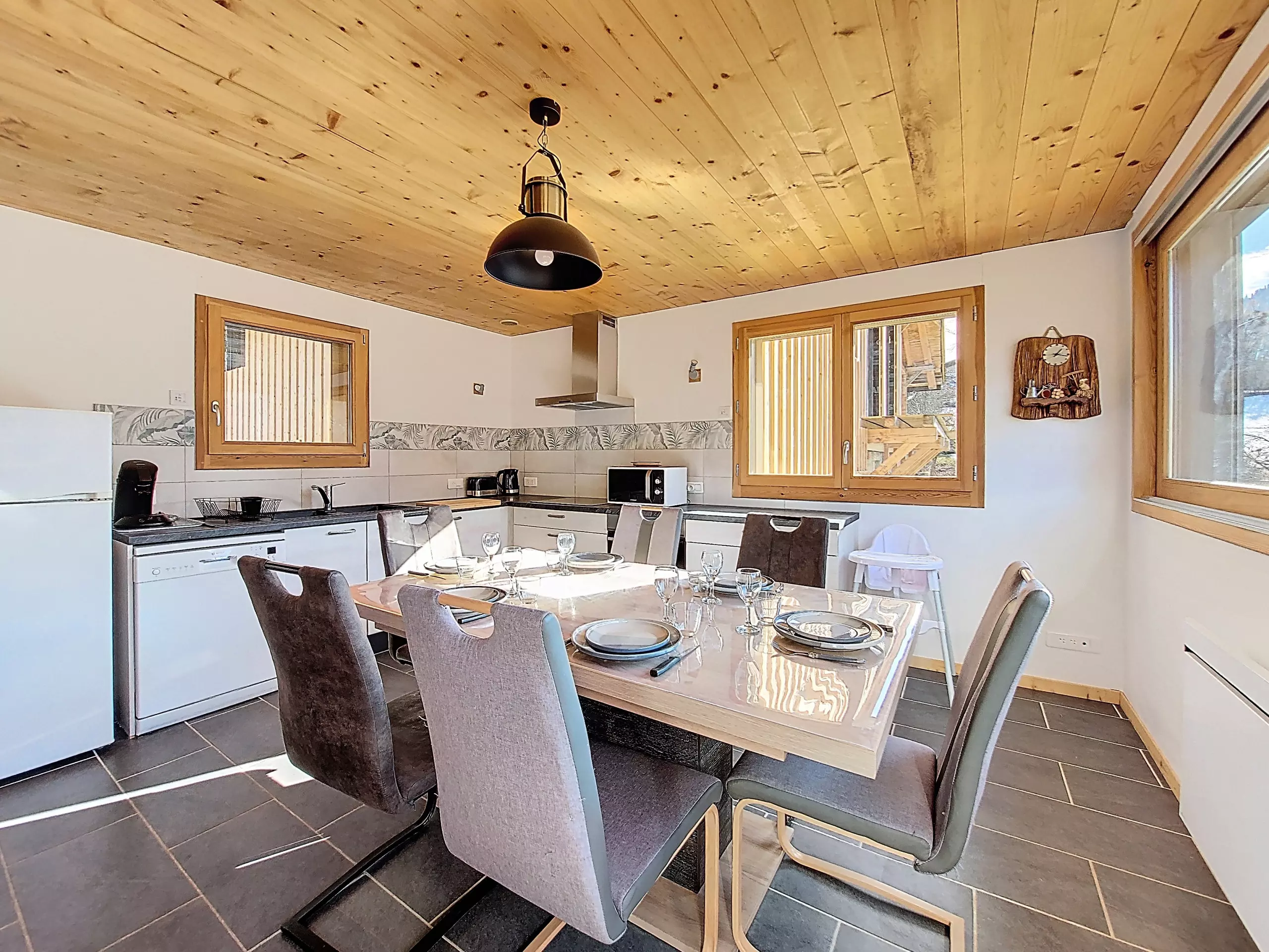 - Essbereich: ein großer, geselliger Tisch mit sechs Stühlen in einem hellen Raum mit herrlichem, unverbautem Blick auf die Berge.