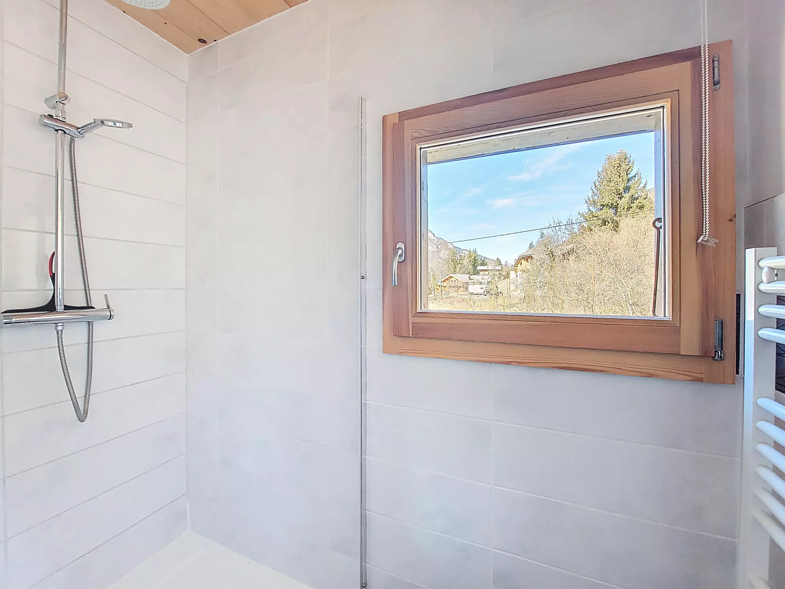 - Badezimmer: Duschkabine, Waschbecken und Handtuchwärmer.