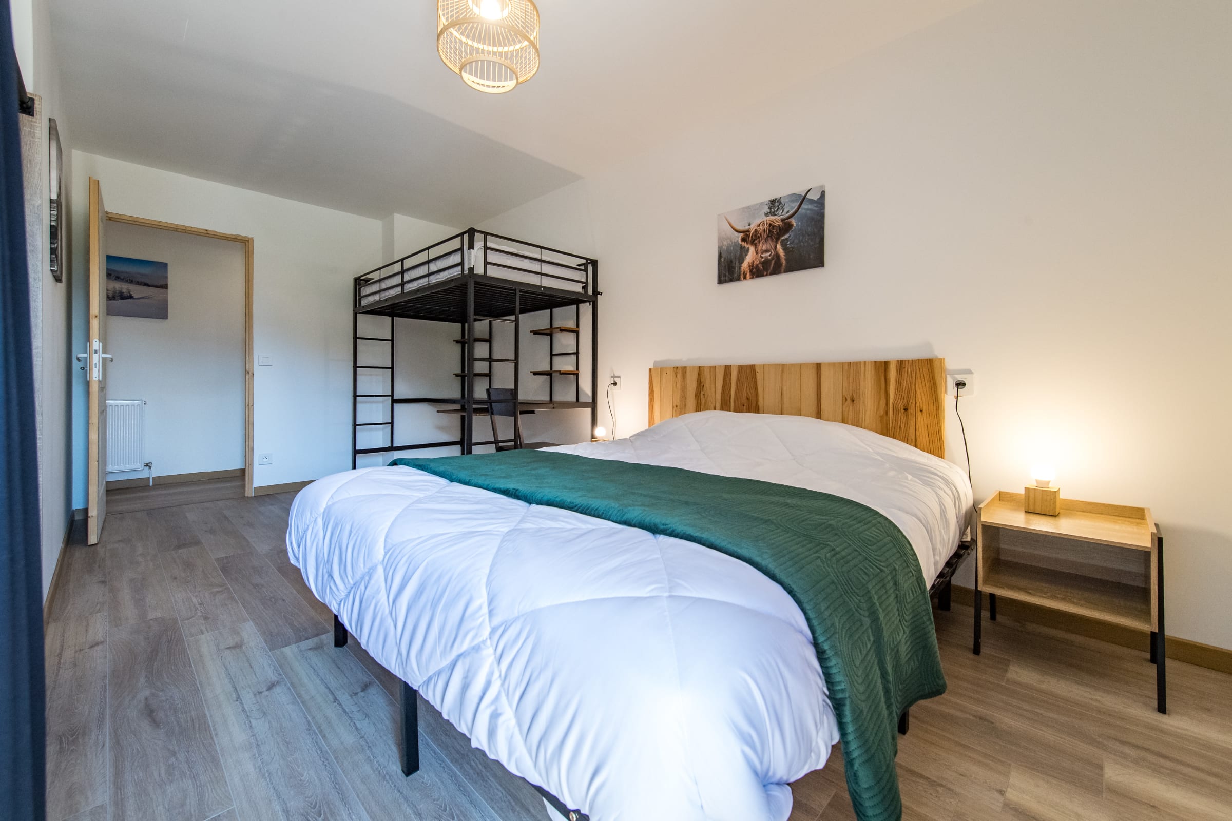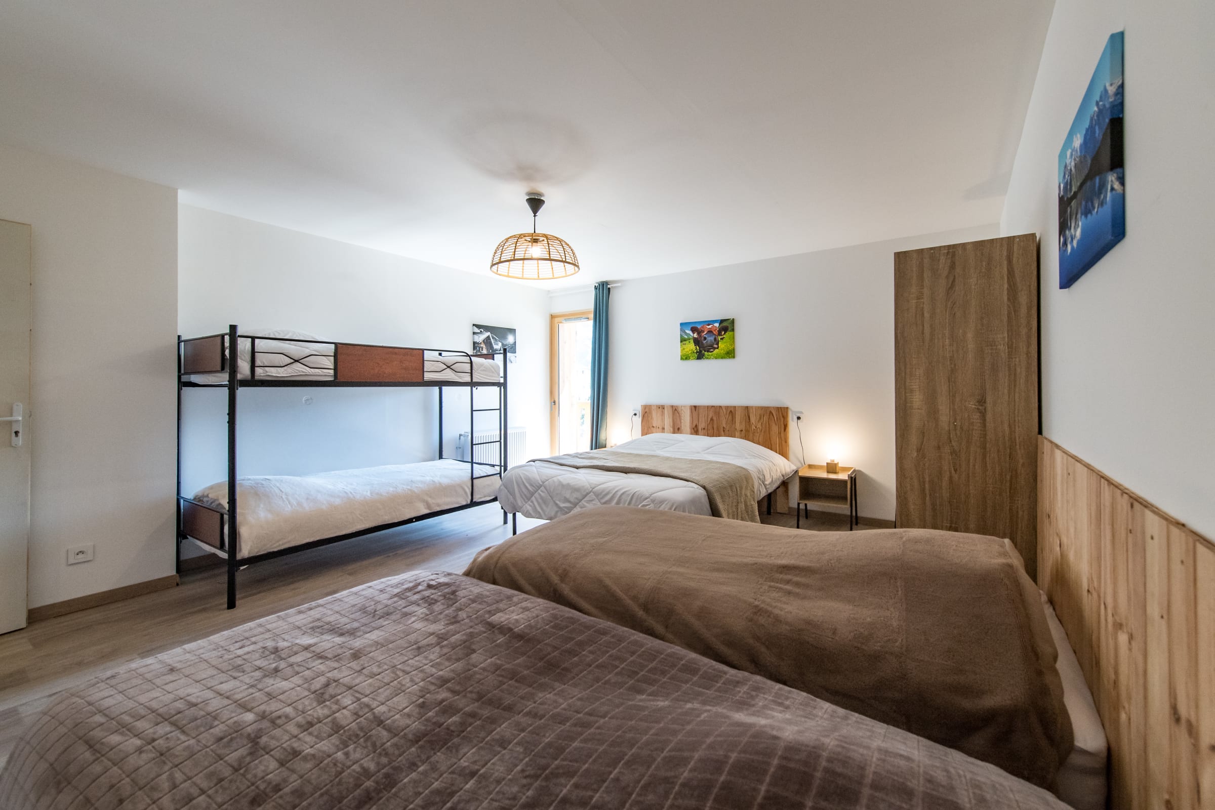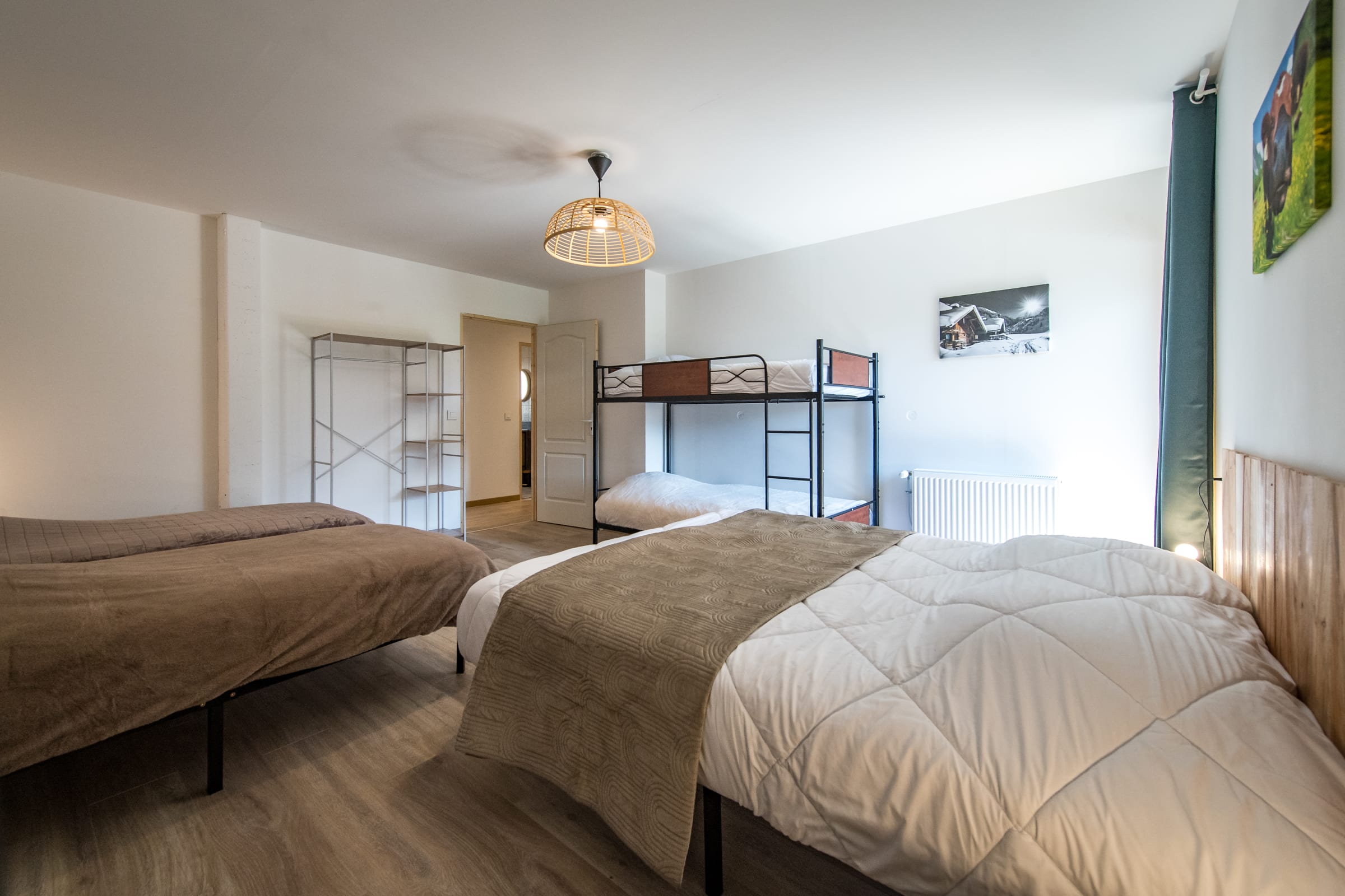 Das letzte Schlafzimmer, als „Schlafsaal“ konzipiert, besitzt ein Queensize-Bett, zwei Einzelbetten und ein Etagenbett – ideal für Kinder.