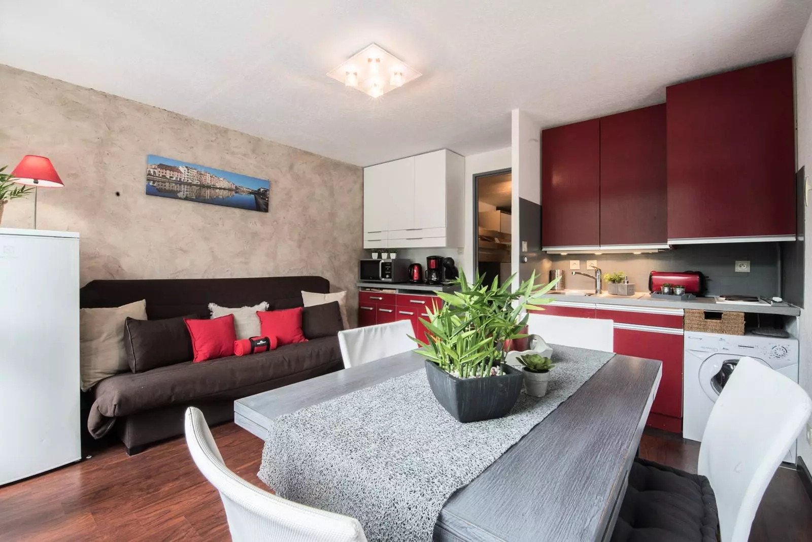 Der Hauptraum besteht aus einer ausgestatteten Küchenzeile, einem Wohnzimmer mit einem Doppelschlafsofa und einem Fernseher.