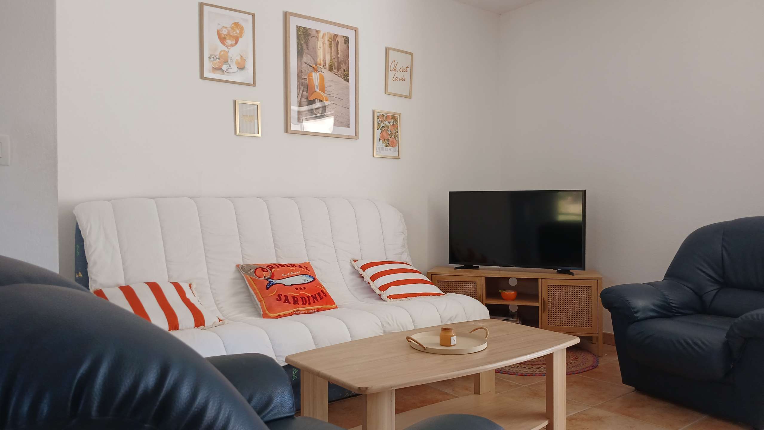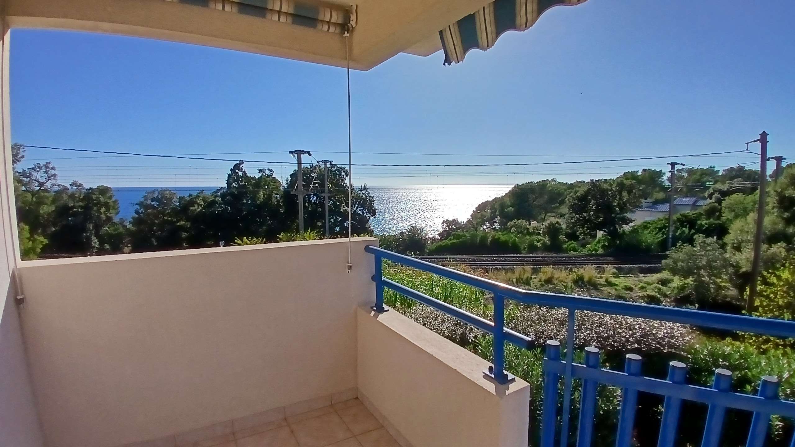 Die Wohnung verfügt über eine geräumige Terrasse mit Meerblick und umfasst ein Wohnzimmer mit ausgestatteter Küche, zwei Schlafzimmer, ein Badezimmer und eine separate Toilette.