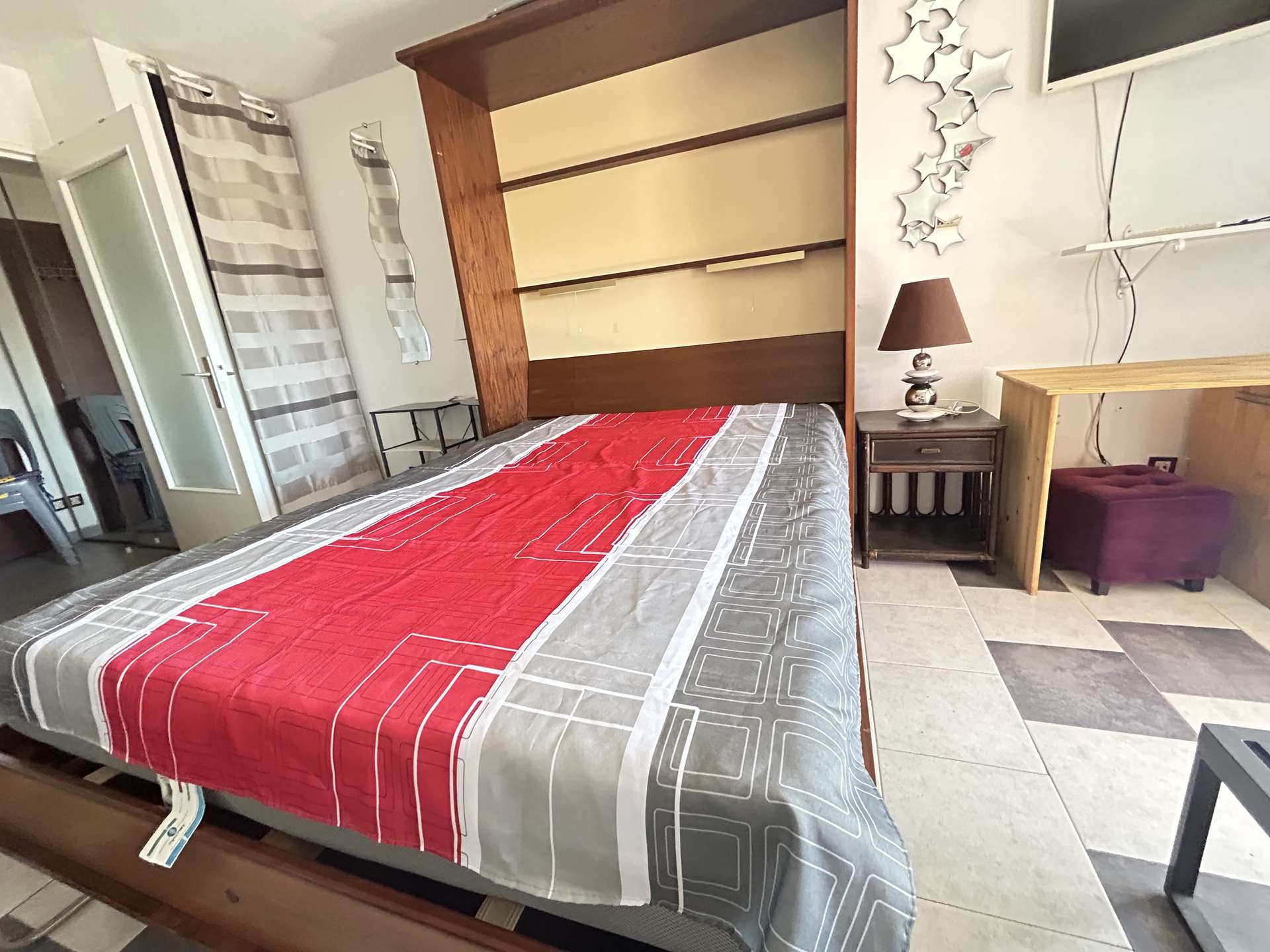 Die Unterkunft: Sie befindet sich in der Residenz La Palmeraie im obersten Stockwerk und besteht aus einer Eingangshalle, einem Duschraum mit Toilette und Waschmaschine, einem Wohnzimmer mit einem Doppelschrankbett und einem Doppelschlafsofa, einem ausgestatteten Küchenbereich, einer Terrasse und einem Parkplatz.