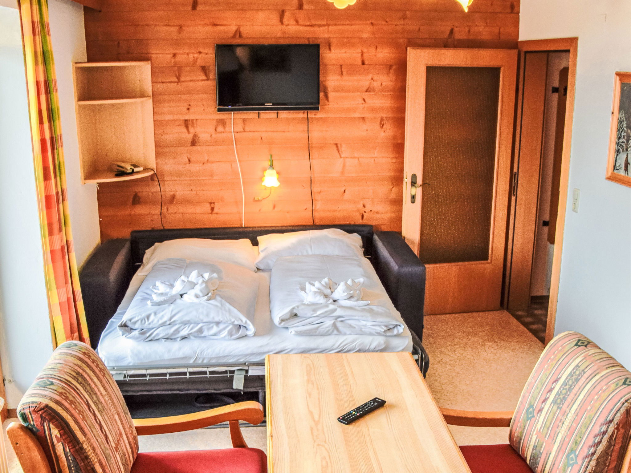 "TOP 23", 3-Zimmer-Wohnung 55 m2 im 2. Stock. Komfortabel und gemütlich eingerichtet: Wohn-/Schlafzimmer mit 1 Doppeldiwanbett, Esstisch und Sat-TV (Flachbildschirm). 1 Doppelzimmer. 1 Zimmer mit 1 x 2 Etagenbetten. Offene Küche (2 Glaskeramikplatten, Wasserkocher, elektrische Kaffeemaschine). Dusche/WC. Solarstrom. Balkon. Balkonmöbel. Zur Verfügung: Internet (WLAN, gratis). Bitte beachten: Nichtraucher-Unterkunft. Maximal 1 Haustier/Hund erlaubt. 50509-000437-2025