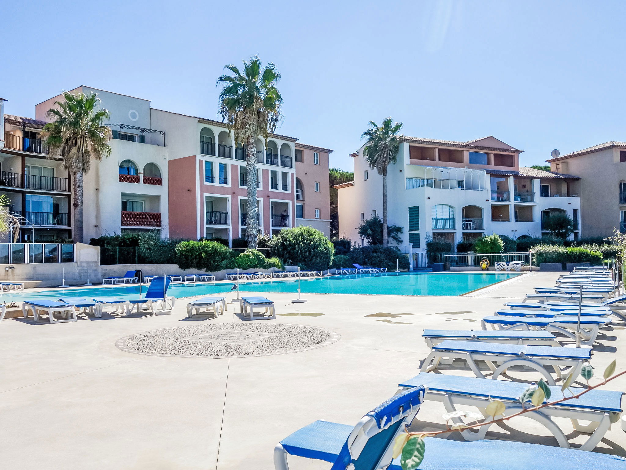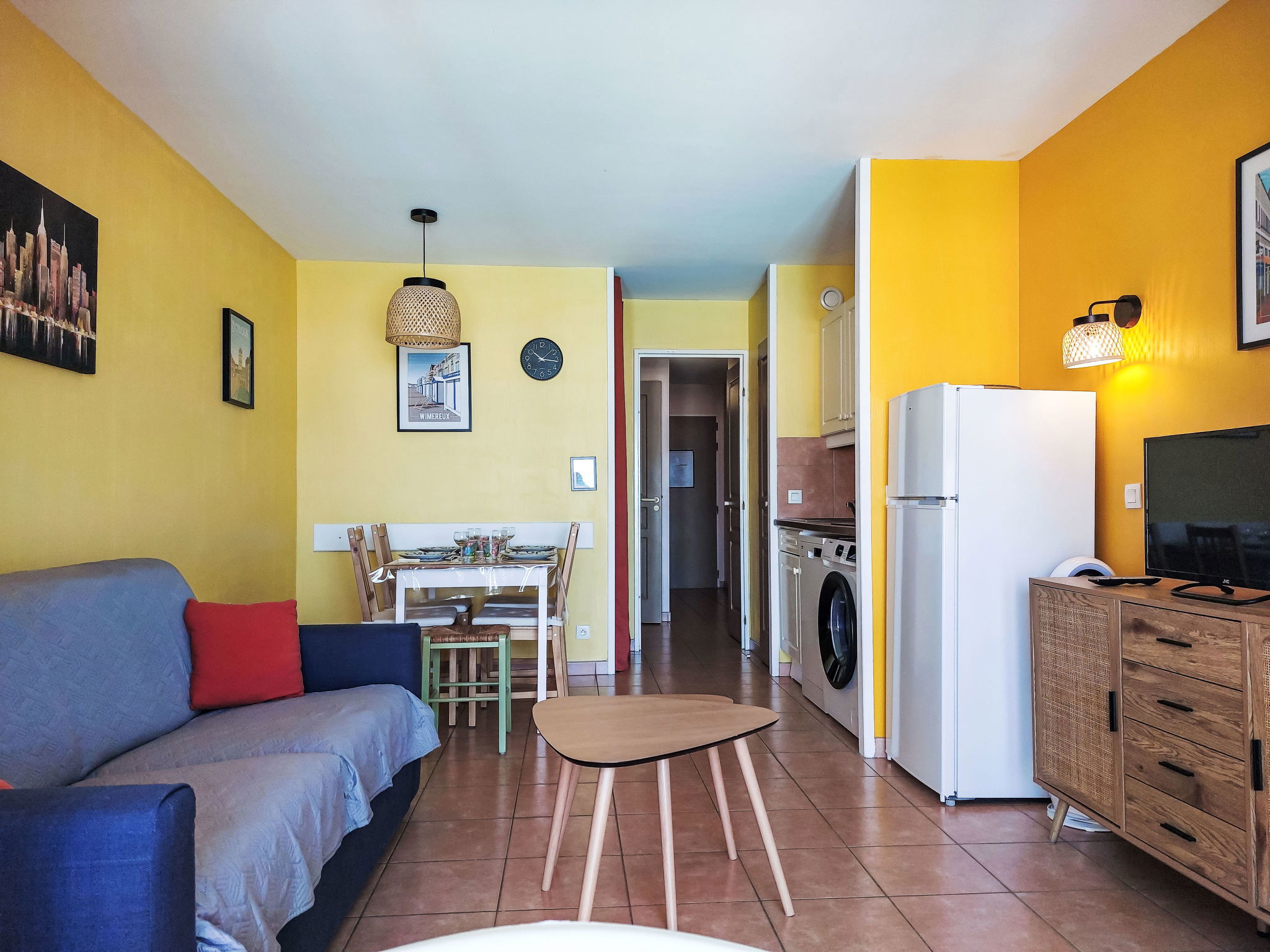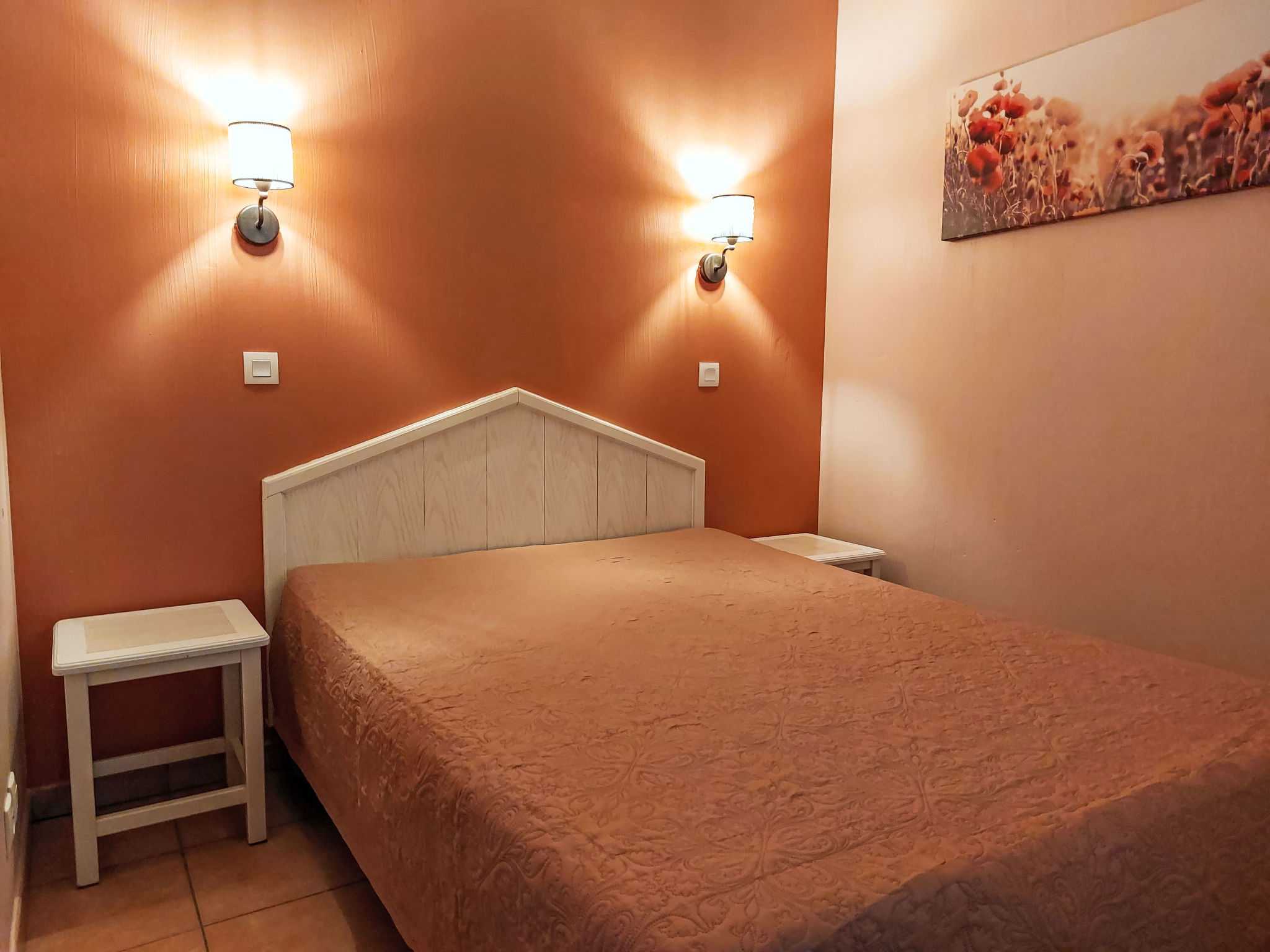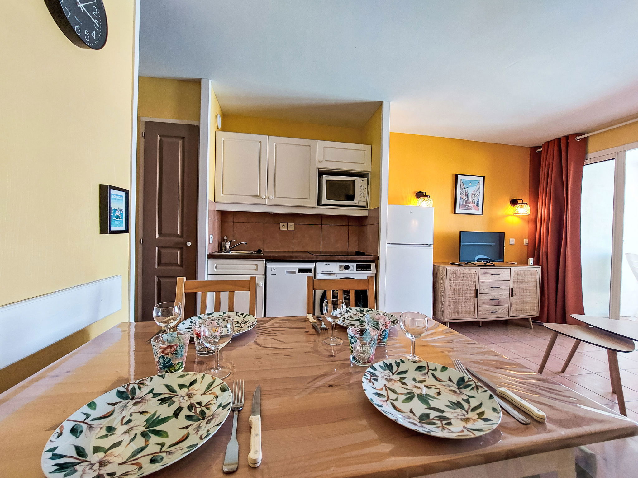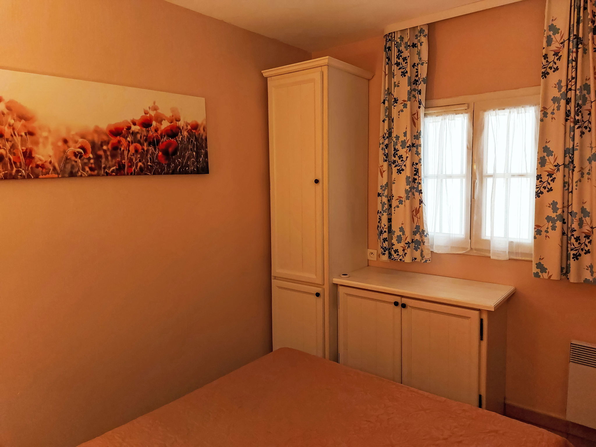2-Zimmer-Wohnung 32 m2 im 1. Stock. Schön eingerichtet: Wohn-/Esszimmer mit 1 Doppeldiwanbett (140 cm, Länge 190 cm), TV (Flachbildschirm). Ausgang zur Terrasse. 1 Zimmer mit 1 franz. Bett (140 cm, Länge 190 cm). Kochnische (Geschirrspüler, 4 Glaskeramikplatten, Toaster, Wasserkocher, Mikrowelle, Tiefkühler, elektrische Kaffeemaschine). Bad, sep. WC. E-Heizung. Terrasse 9 m2, überdacht, Westlage. Terrassenmöbel. Herrliche Sicht auf das Meer und das Schwimmbad. Zur Verfügung: Waschmaschine. Internet (WLAN, extra). Parkplatz Nr. 454 (Niveau 1) (überdacht), Höhe 190 cm, Breite 232 cm. Bitte beachten: Maximal 1 Haustier/Hund erlaubt. TV nur FR. Rauchmelder.