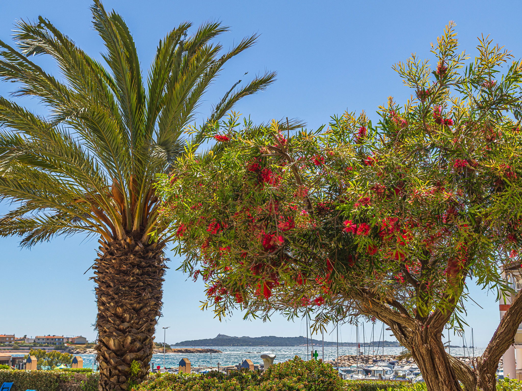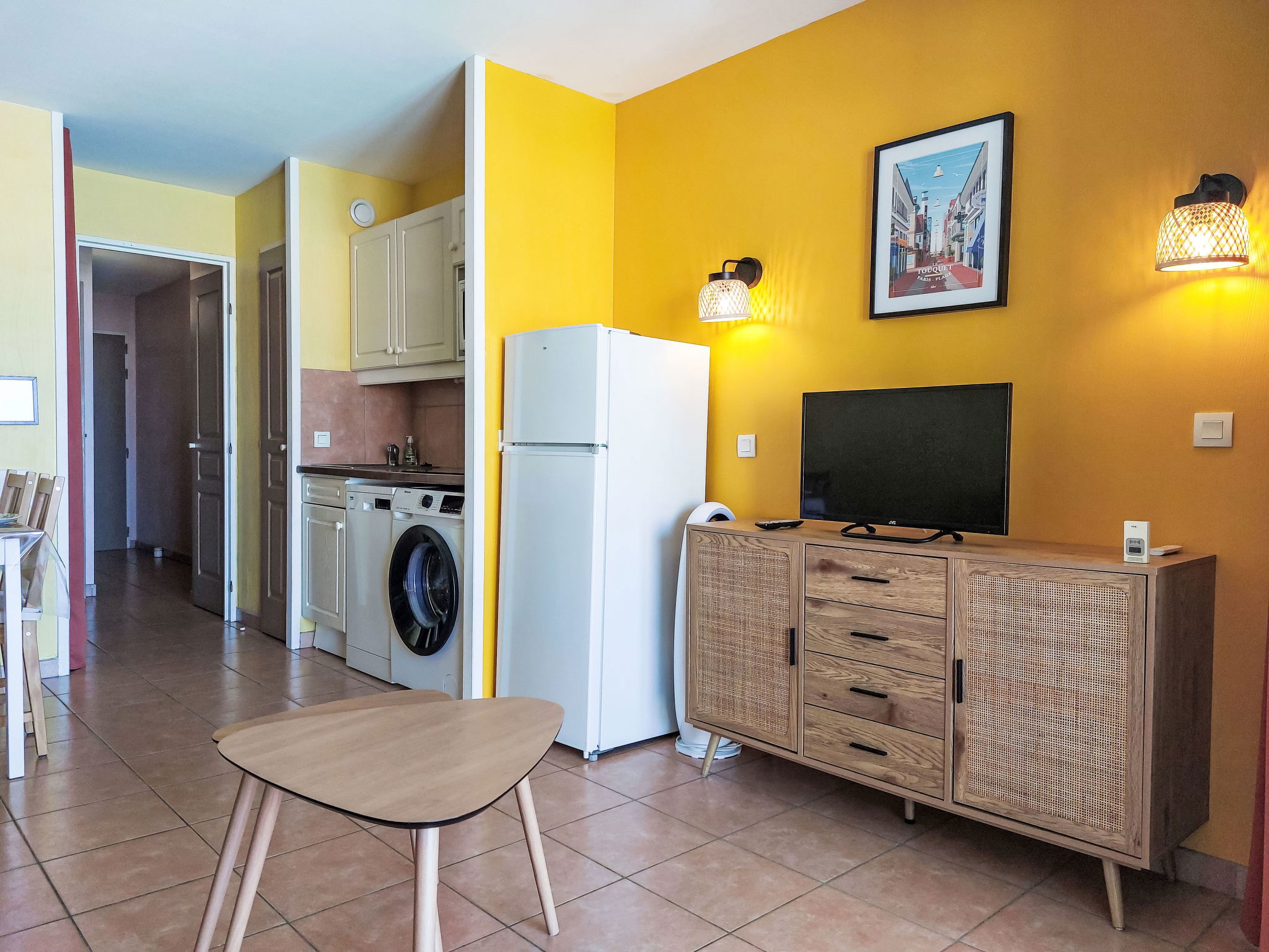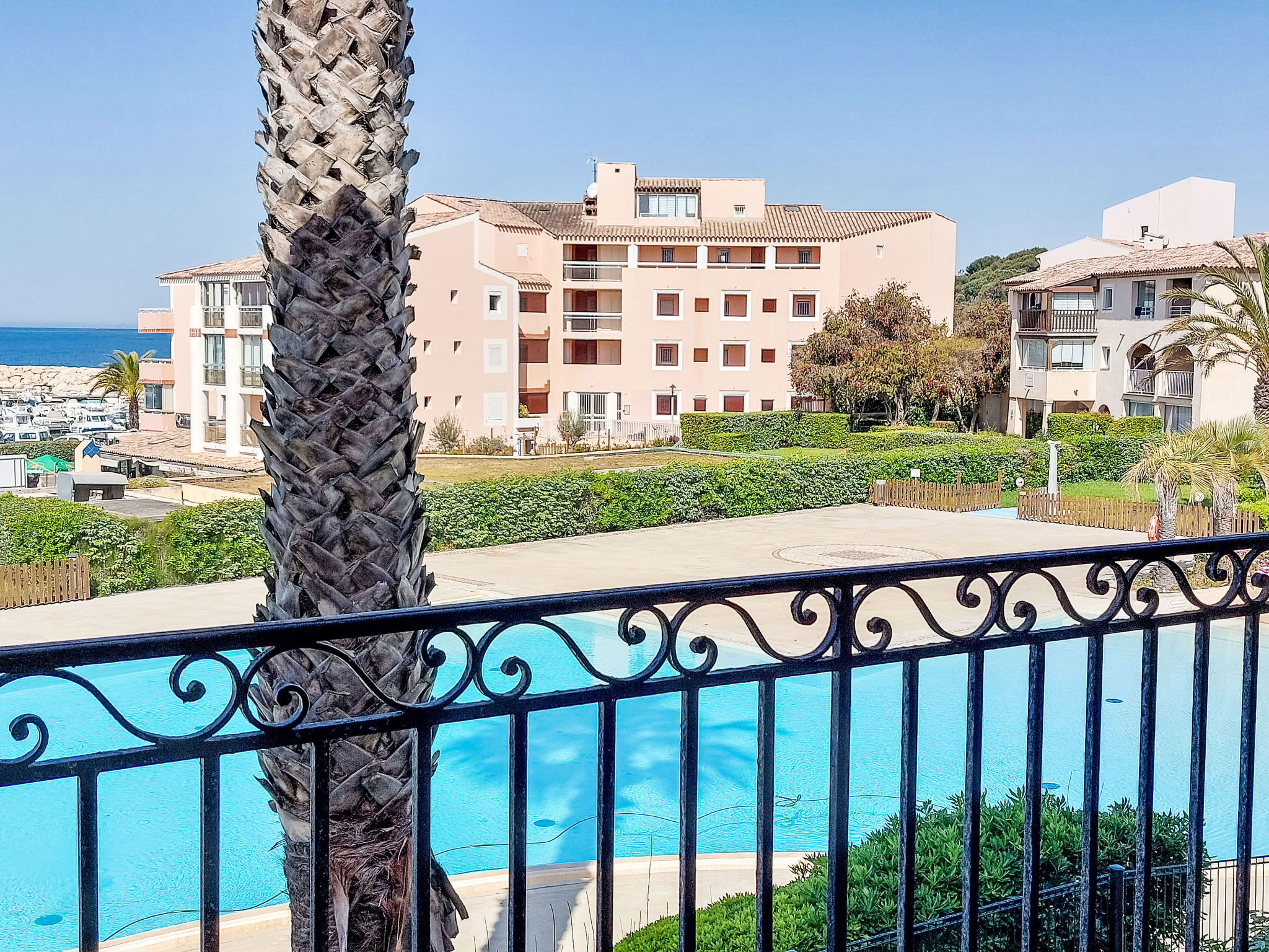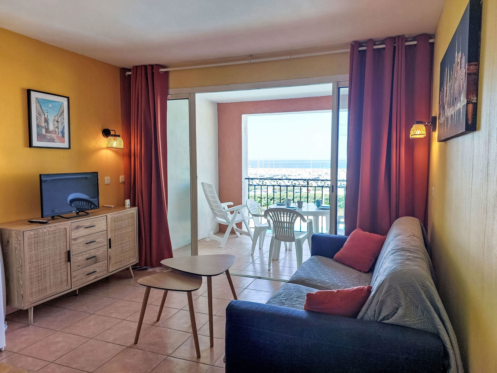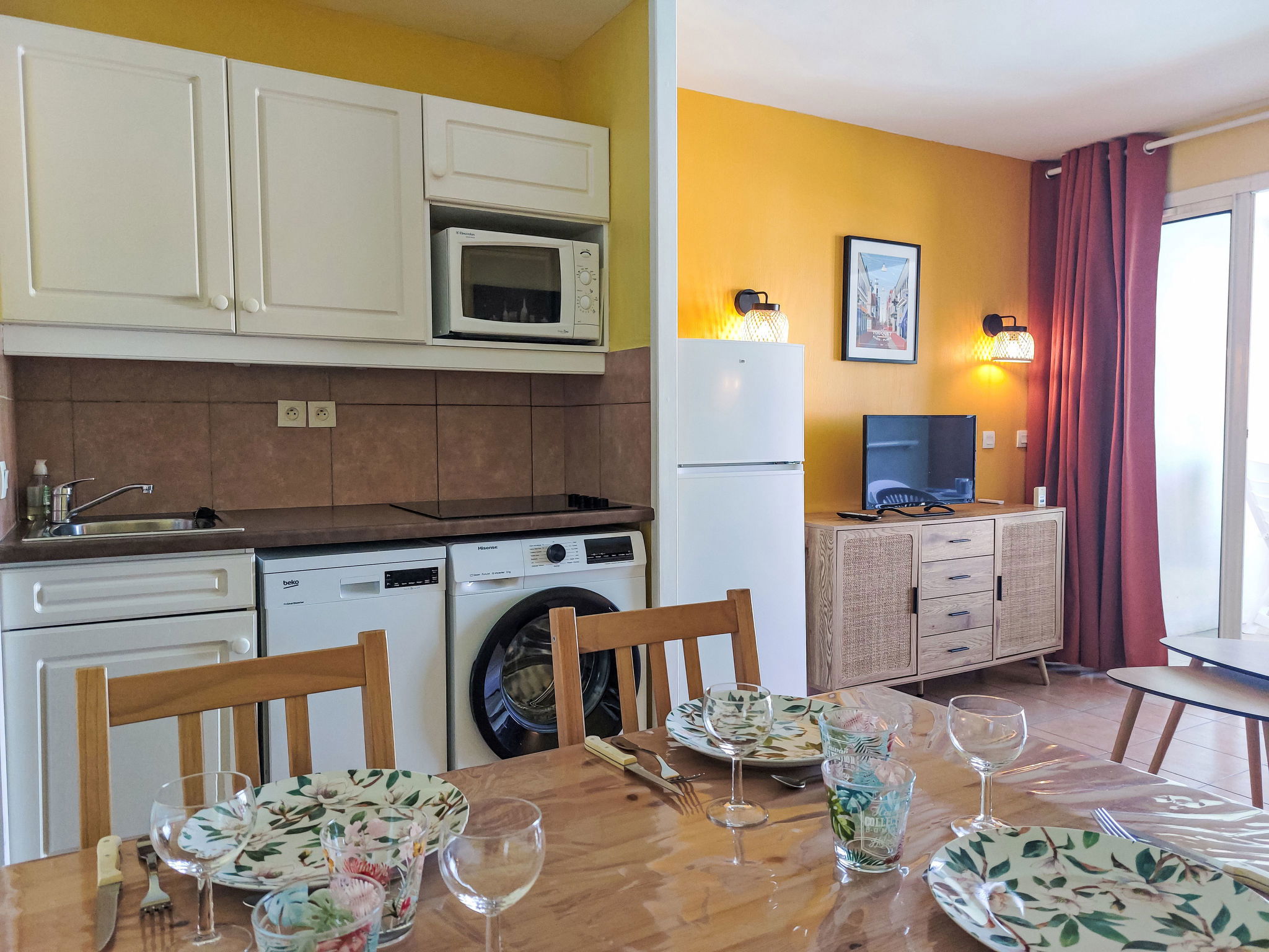 2-Zimmer-Wohnung 32 m2 im 1. Stock. Schön eingerichtet: Wohn-/Esszimmer mit 1 Doppeldiwanbett (140 cm, Länge 190 cm), TV (Flachbildschirm). Ausgang zur Terrasse. 1 Zimmer mit 1 franz. Bett (140 cm, Länge 190 cm). Kochnische (Geschirrspüler, 4 Glaskeramikplatten, Toaster, Wasserkocher, Mikrowelle, Tiefkühler, elektrische Kaffeemaschine). Bad, sep. WC. E-Heizung. Terrasse 9 m2, überdacht, Westlage. Terrassenmöbel. Herrliche Sicht auf das Meer und das Schwimmbad. Zur Verfügung: Waschmaschine. Internet (WLAN, extra). Parkplatz Nr. 454 (Niveau 1) (überdacht), Höhe 190 cm, Breite 232 cm. Bitte beachten: Maximal 1 Haustier/Hund erlaubt. TV nur FR. Rauchmelder.