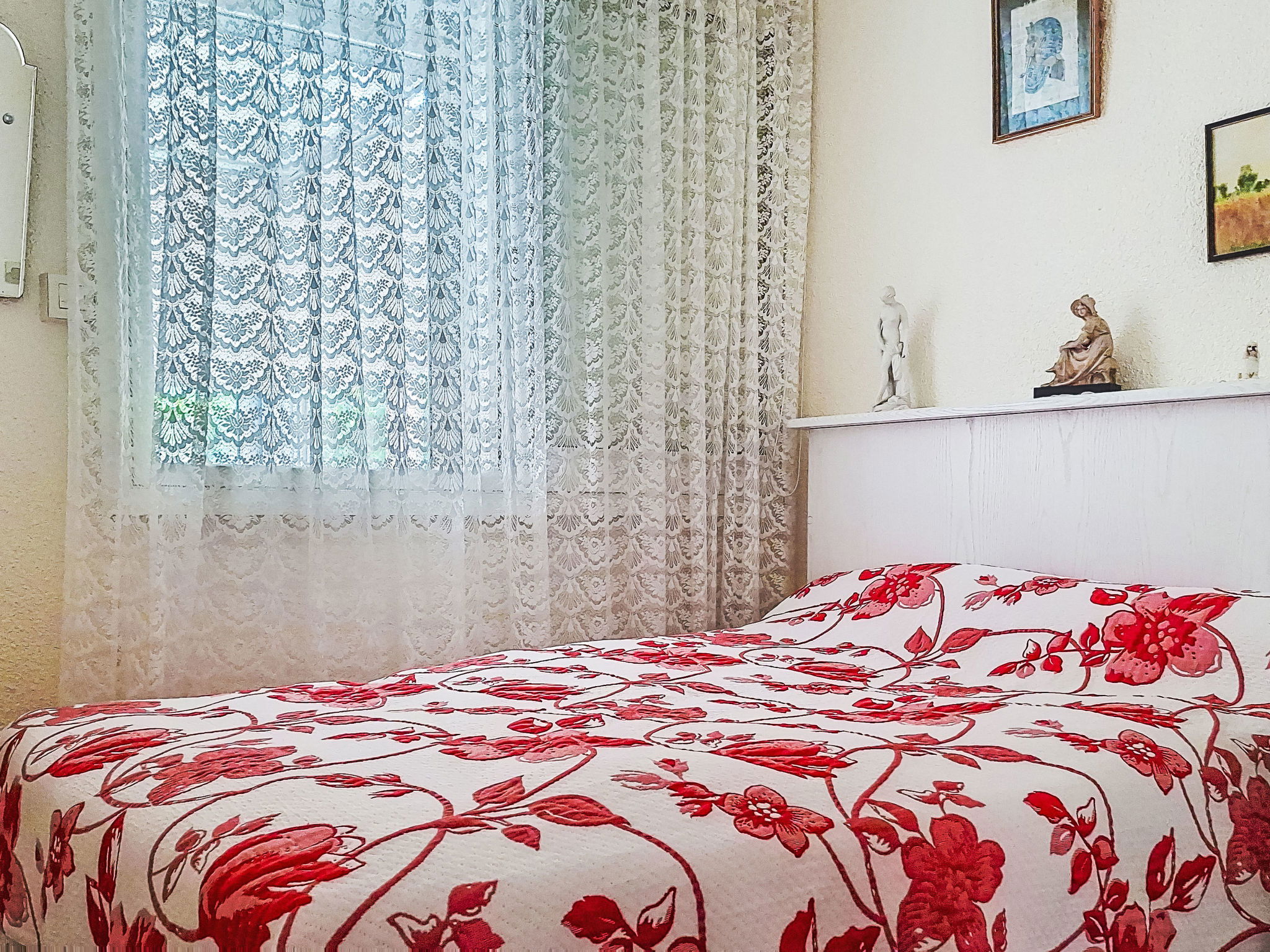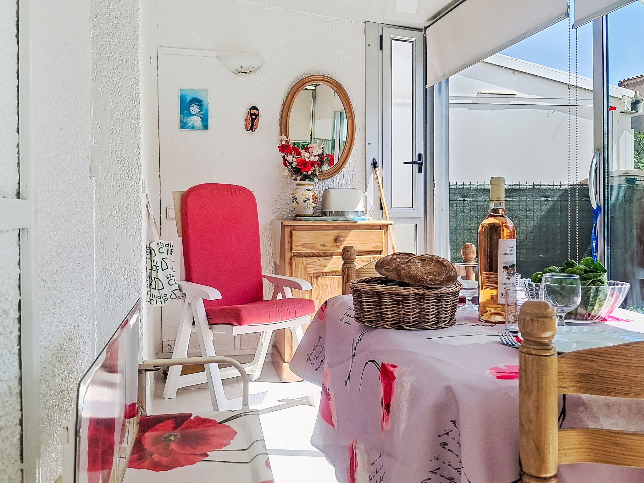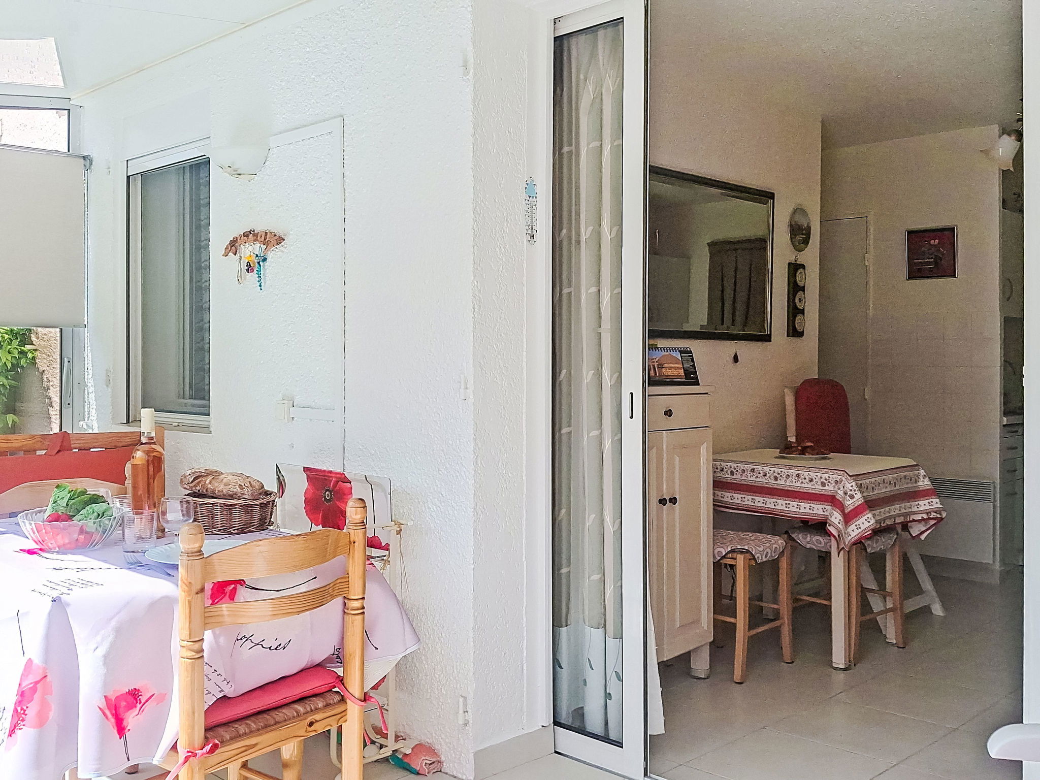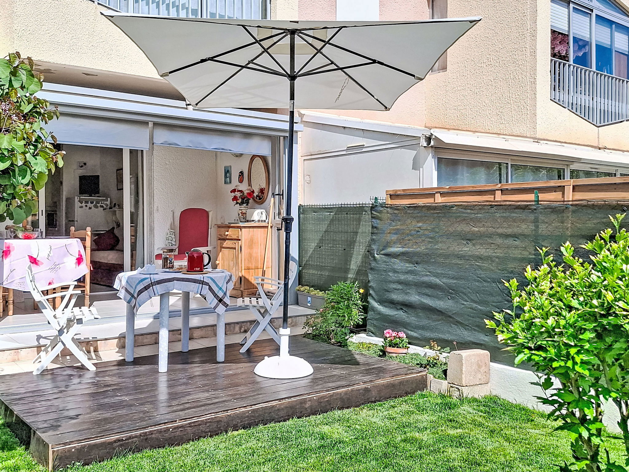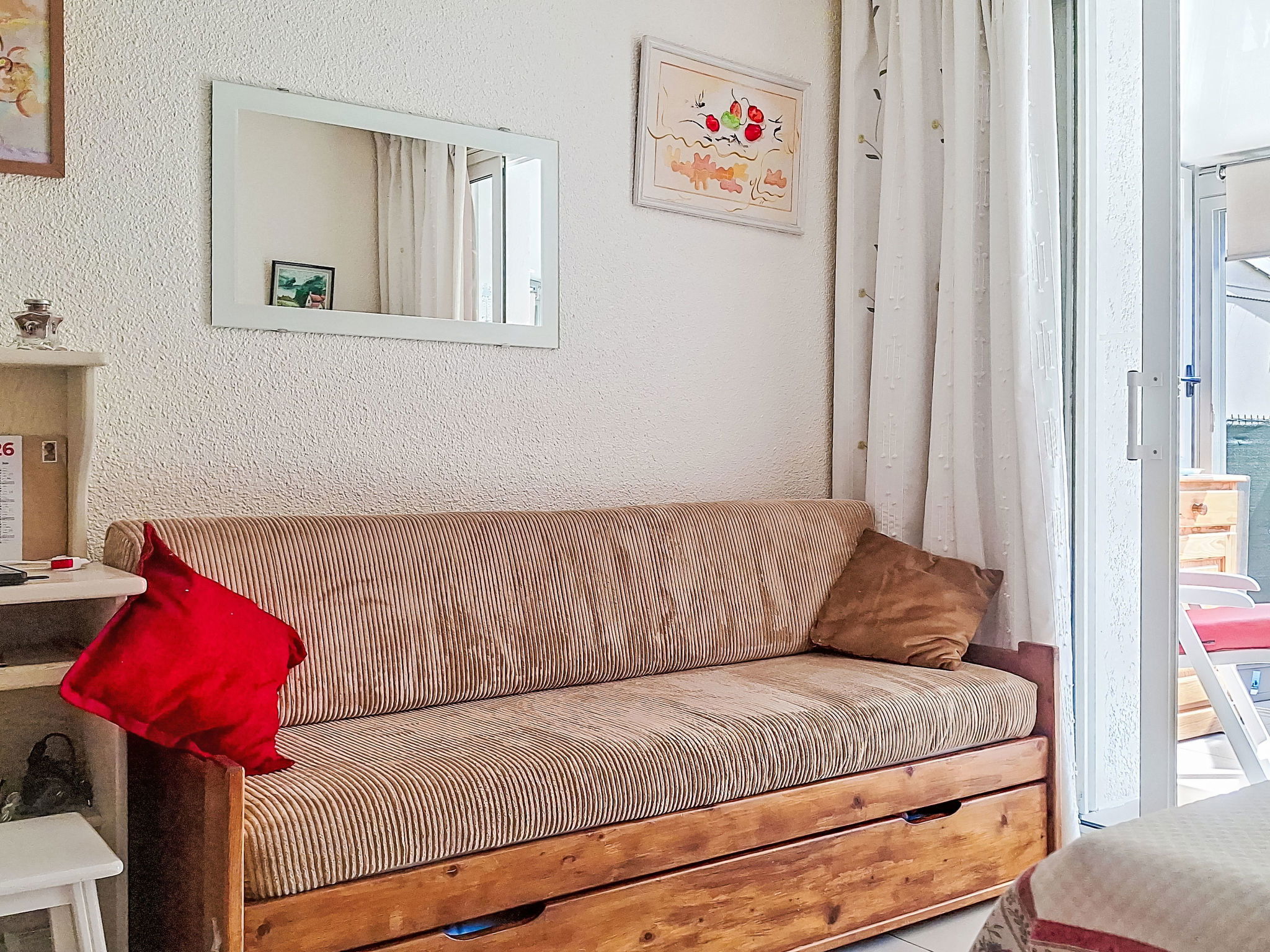 2-Zimmer-Wohnung 29 m2, im Erdgeschoss. Schön eingerichtet: Wohn-/Esszimmer mit 1 Bett (80 cm, Länge 190 cm), 1 Schlafmöglichkeit (70 cm, Länge 190 cm), TV (Flachbildschirm), Ventilator. Ausgang zur Terrasse. 1 Zimmer mit 1 franz. Bett (1 x 140 cm, Länge 190 cm), TV (Flachbildschirm). Kochnische (Geschirrspüler, 4 Glaskeramikplatten, Toaster, Wasserkocher, Mikrowelle, elektrische Kaffeemaschine). Bad, sep. WC. E-Heizung. Terrasse 30 m2, überdacht. Terrassenmöbel. Parkplatz. Bitte beachten: Maximal 1 kleines Haustier/Hund erlaubt. TV nur FR. Rauchmelder. Inserat einer Privatperson nach Artikel 155, IV, CGI.