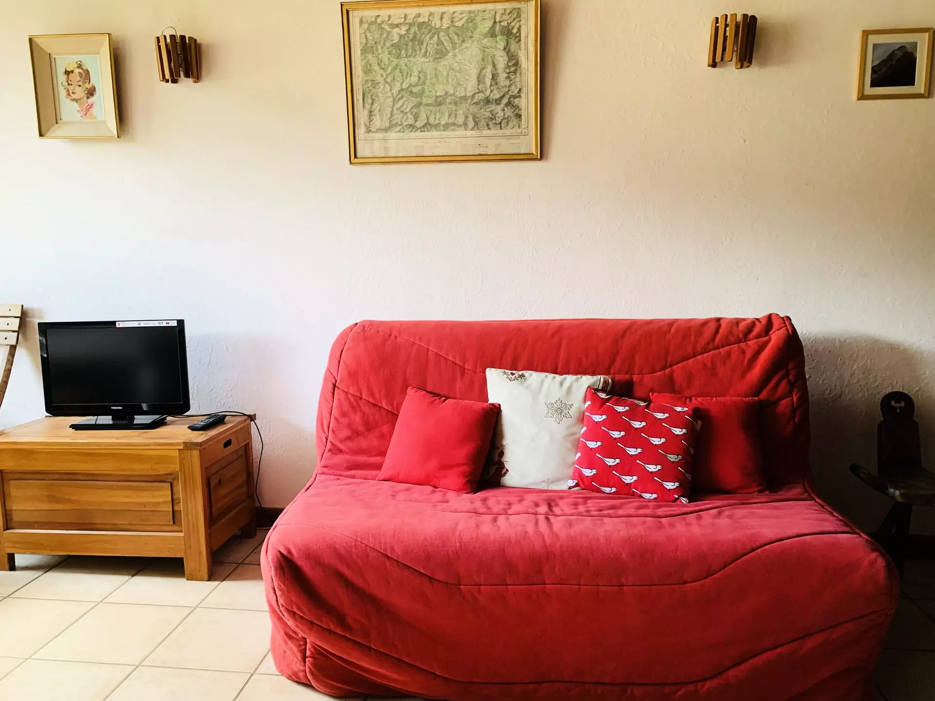 * Wohnzimmer: 1 Doppelschlafsofa, 1 Einzelbank, Essbereich, HD-TV, Fliesenboden, Zugang zum Balkon;