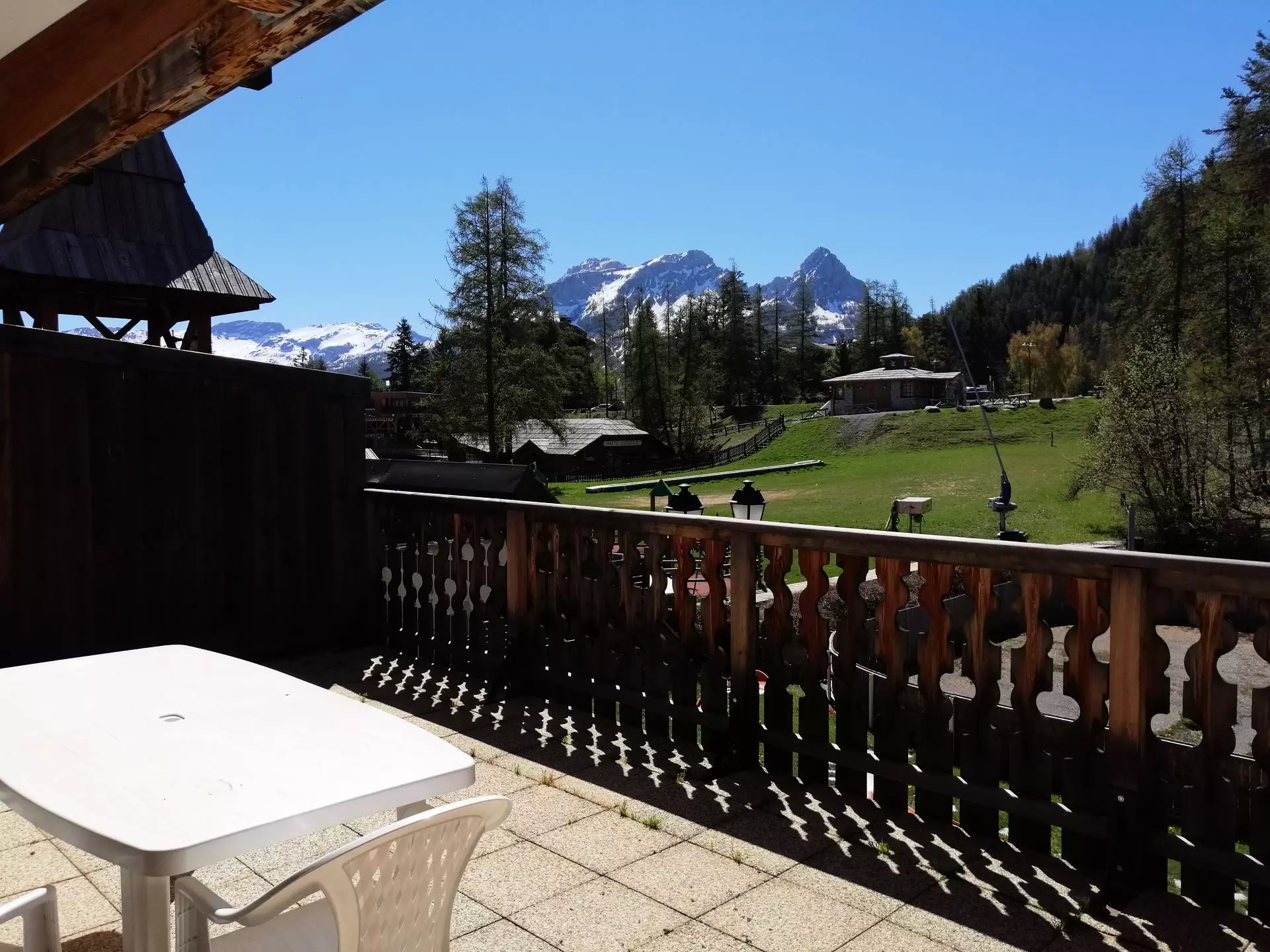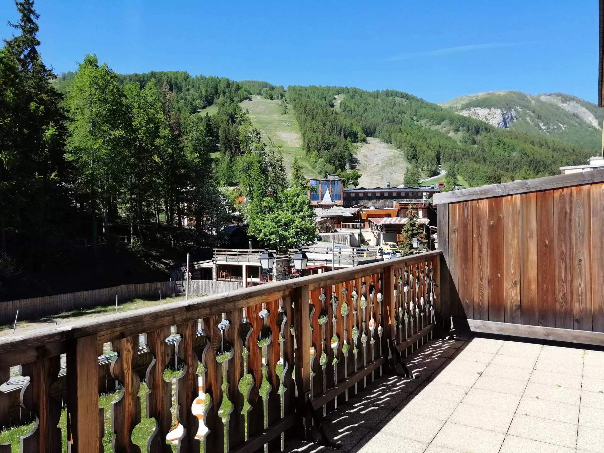 2-Zimmer-Appartement für 4-6 Personen, ca. 48m². Befindet sich im 1. Stock. Südlage mit großer Terrasse und Panoramablick auf die Pisten, die Eisbahn und die Geschäfte.