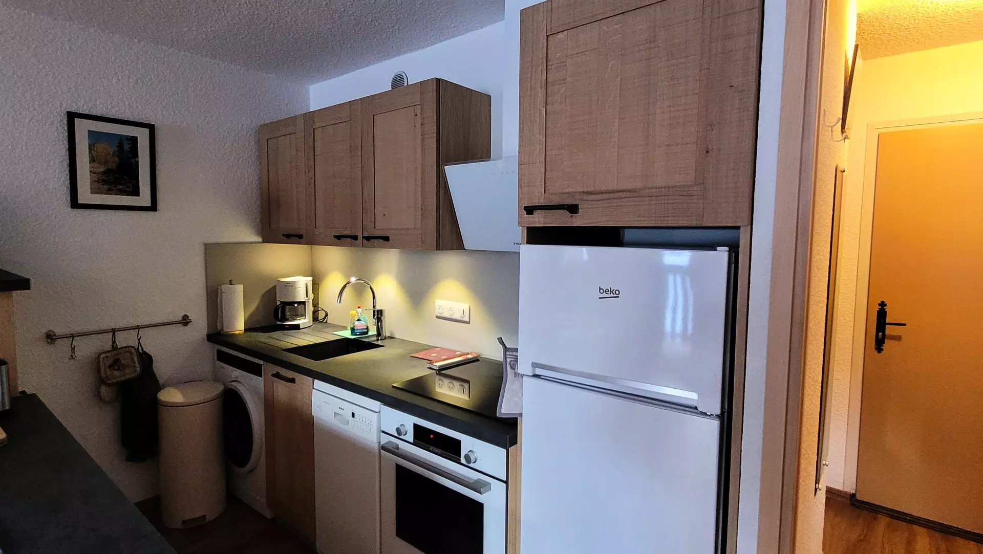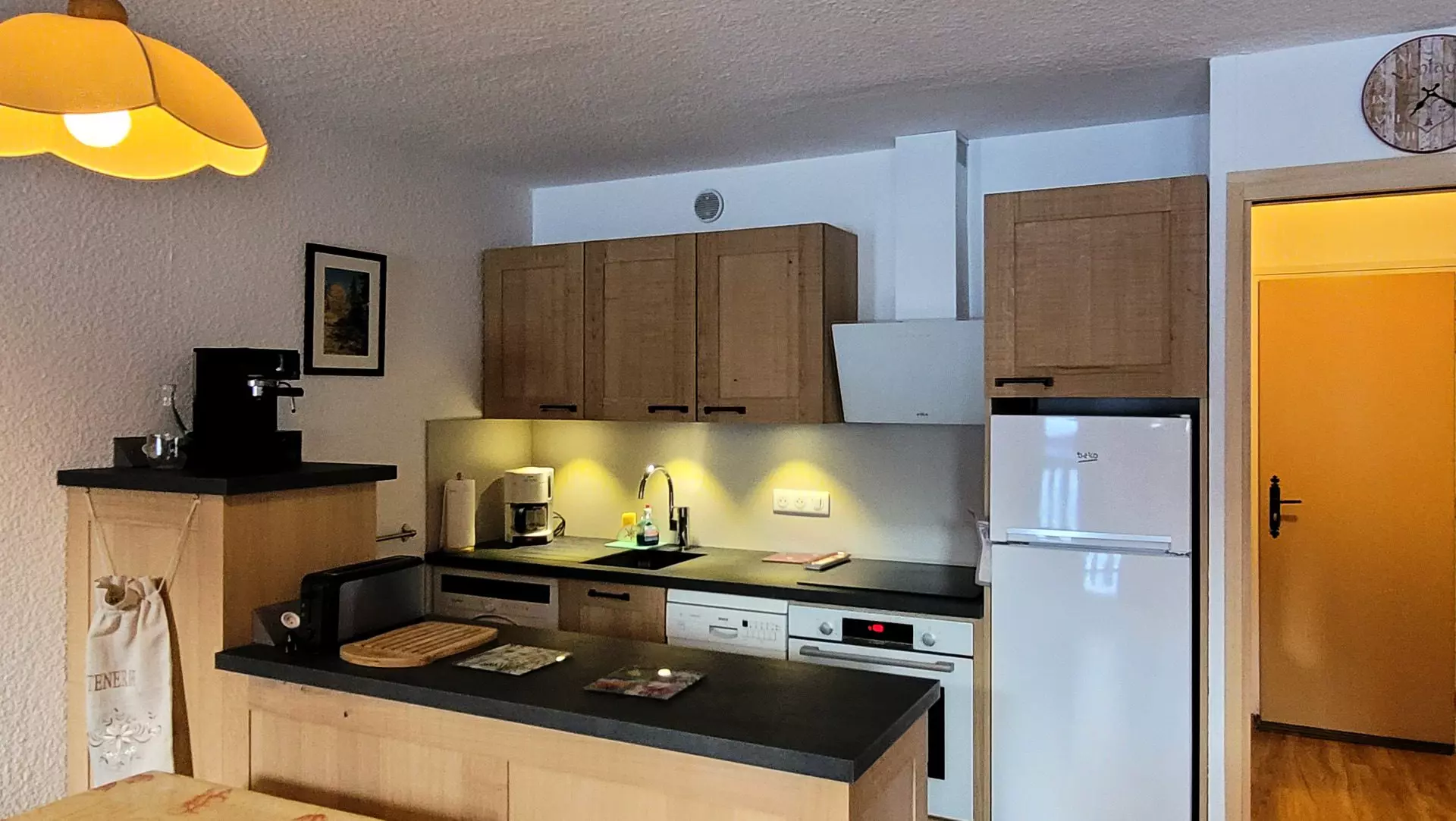 Ausstattung: Ausgestatteter Küchenbereich (Cerankochfeld, Backofen, Mikrowelle, Kühlschrank, Geschirrspüler, Waschmaschine), Wohnbereich mit TV.