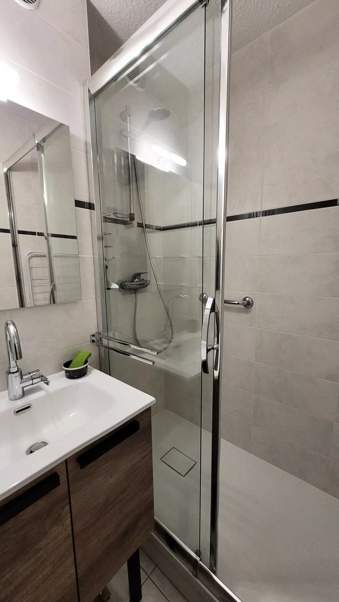 Sanitäre Einrichtungen: Badezimmer mit Dusche und Waschbecken. Separates WC.