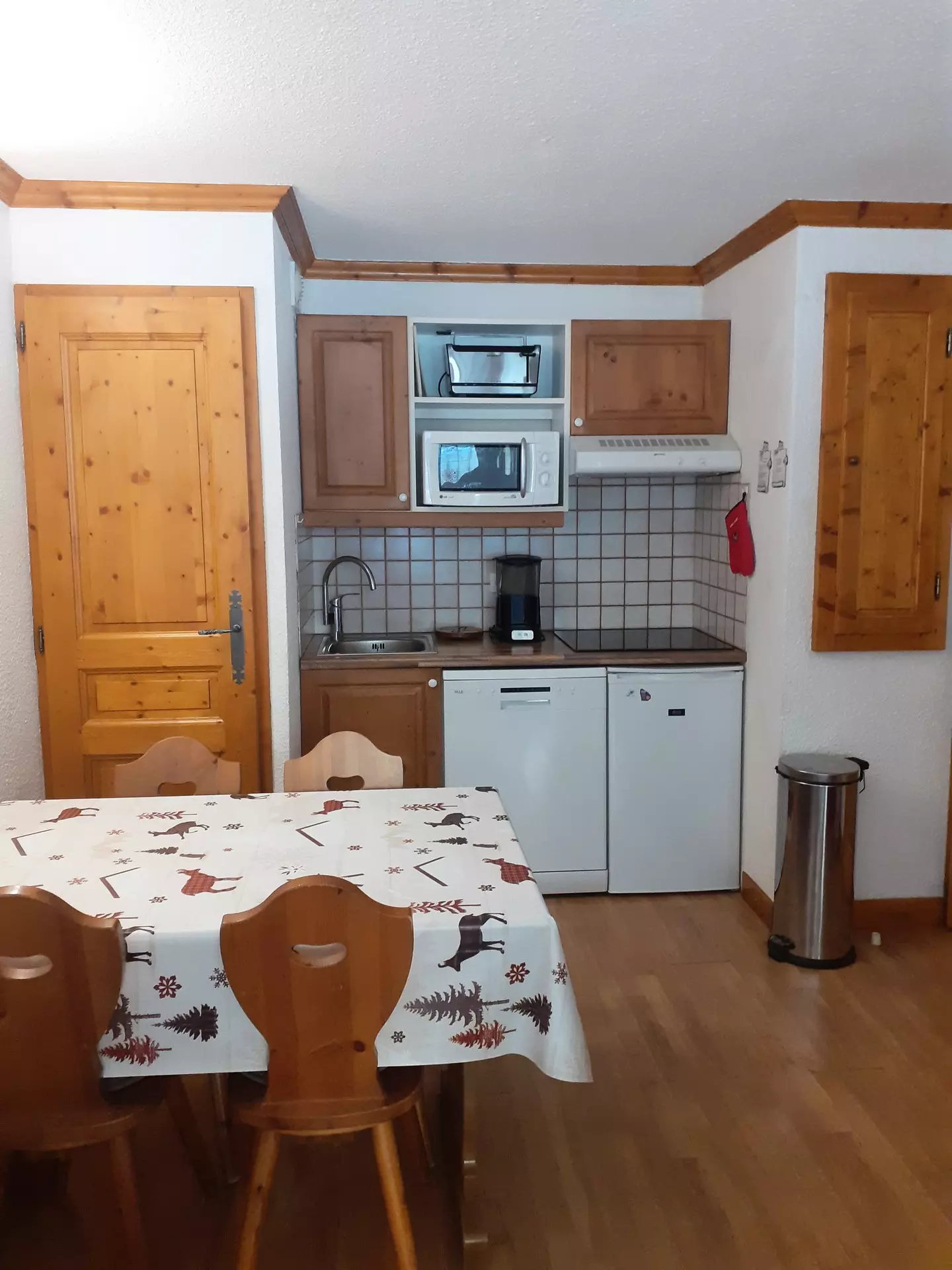 - Küchenbereich: Mikrowelle, Induktionskochfeld, Backofen, Geschirrspüler, Kühlschrank (110 l mit Gefrierfach)