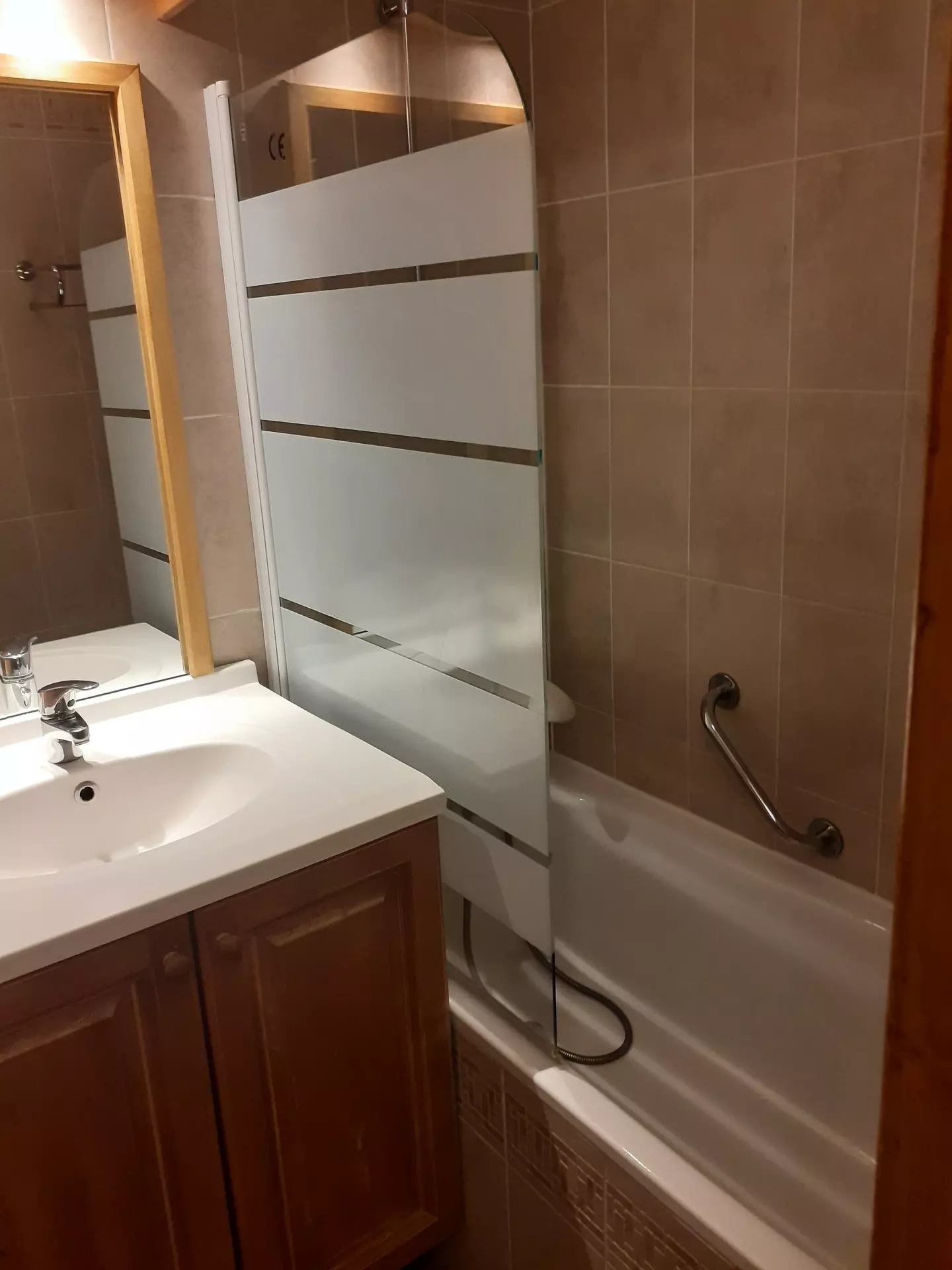 Badezimmer: Waschbecken, Badewanne und Haartrockner. Separate Toilette.