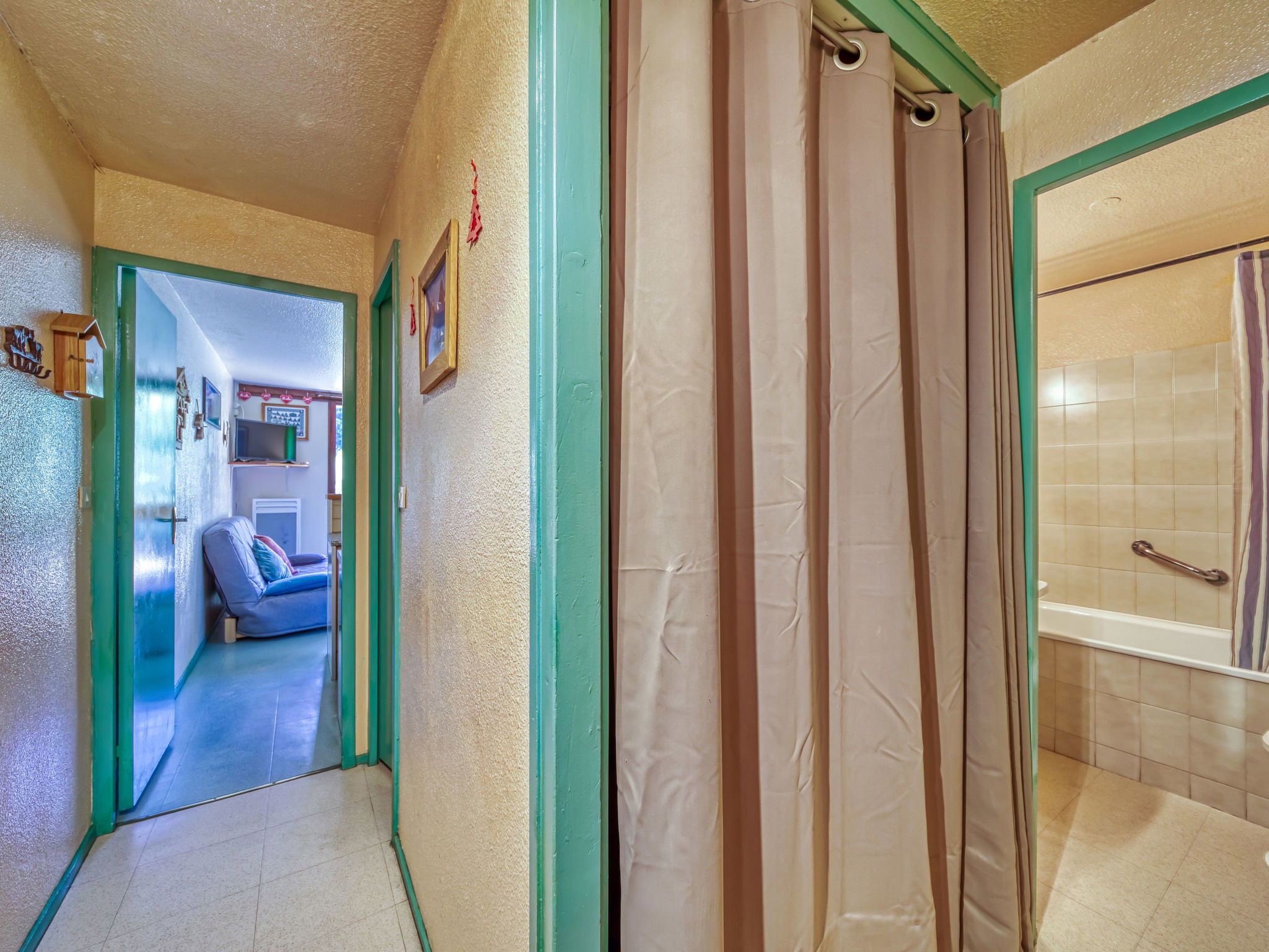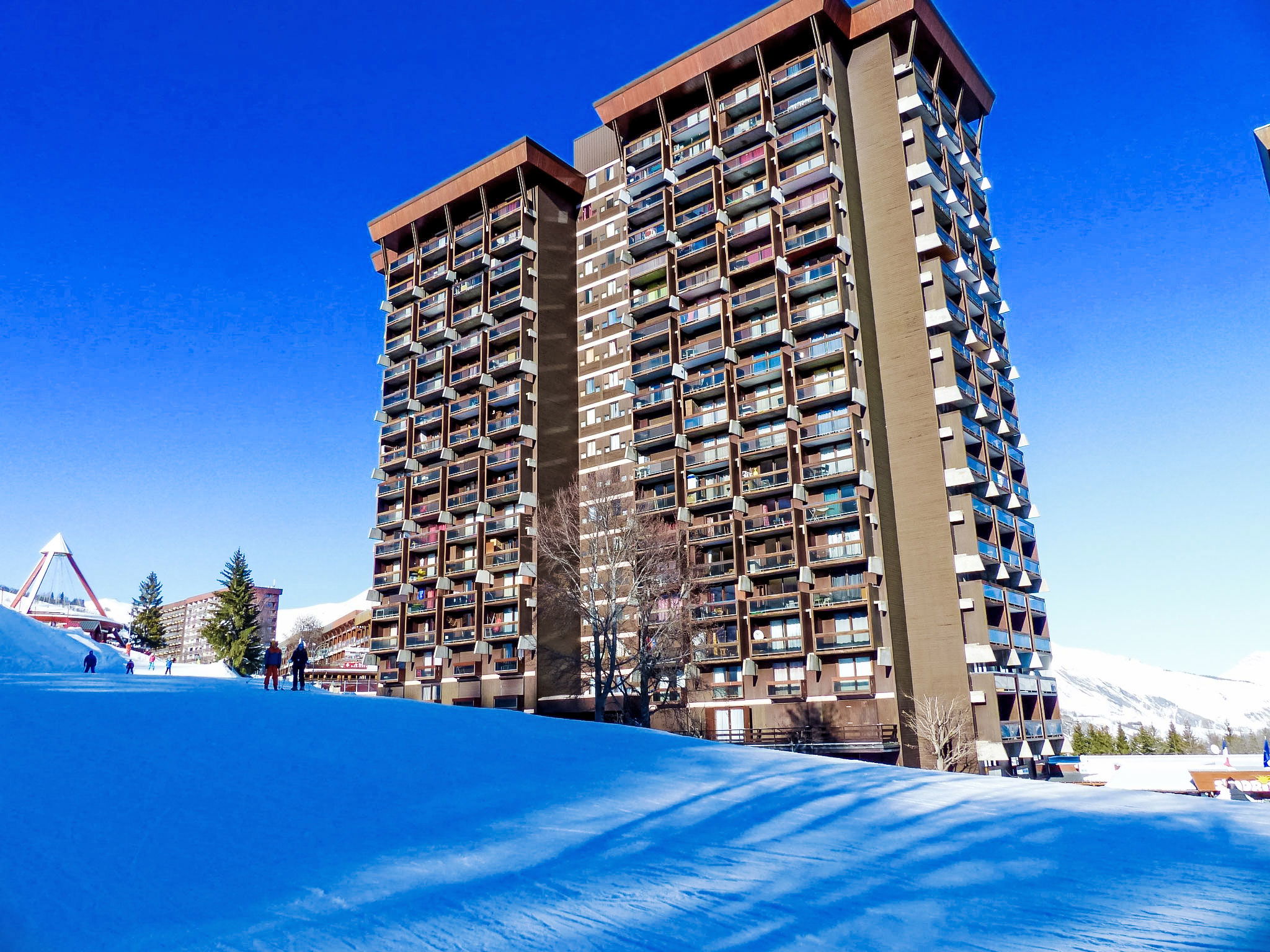 2-Zimmer-Wohnung 32 m2 im 12. Stock, Südlage. Komfortabel eingerichtet: Wohn-/Esszimmer mit 1 Doppeldiwanbett (130 cm, Länge 190 cm), TV (Flachbildschirm). Ausgang zum Balkon, Richtung Süden. 1 kleines Zimmer, Fenster zum Wohnzimmer mit 1 x 2 Etagenbetten (90 cm, Länge 190 cm). Kochnische (2 Kochplatten, Mini-Backofen, Toaster, Mikrowelle, Tiefkühler, elektrische Kaffeemaschine) mit Bar. Bad, sep. WC. E-Heizung. Balkon 4 m2, Südlage. Balkonmöbel, Liegestühle (2). Sicht auf die Berge und die Skipiste. Zur Verfügung: Haartrockner. Internet (WLAN, extra). Bitte beachten: Nichtraucher-Unterkunft. Maximal 1 Haustier/Hund erlaubt. Rauchmelder. Anstelle eines abgeschlossenen Schlafzimmers befinden sich manche Schlafplätze in einem offenen Bereich (Galerie, Nische etc.).