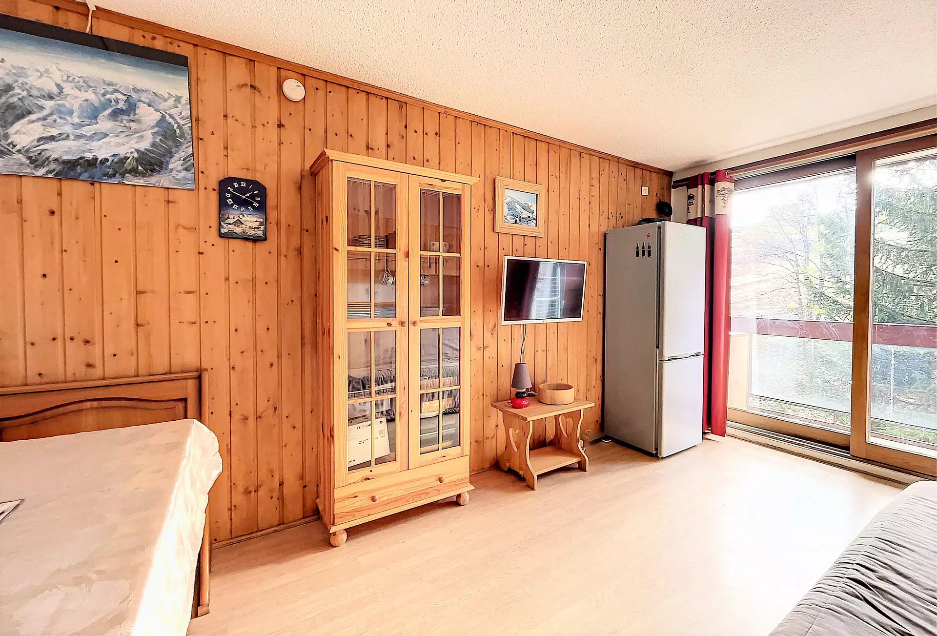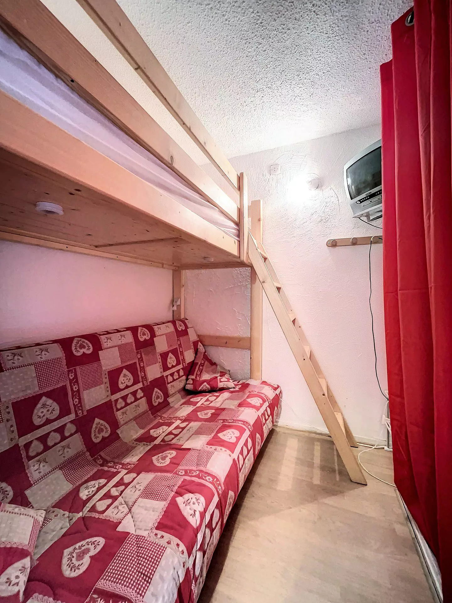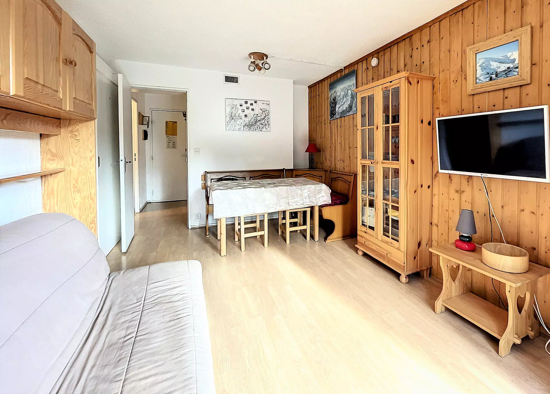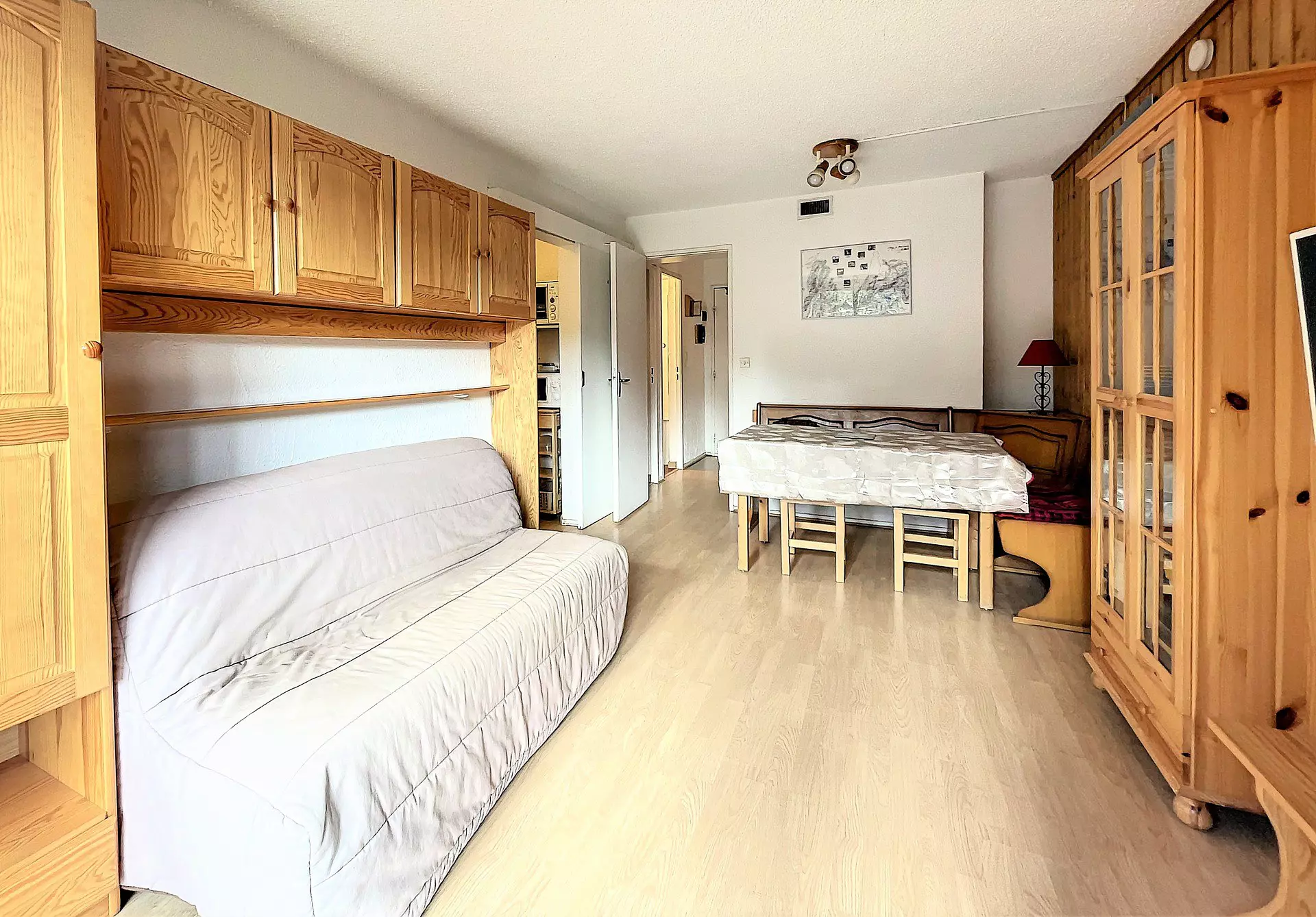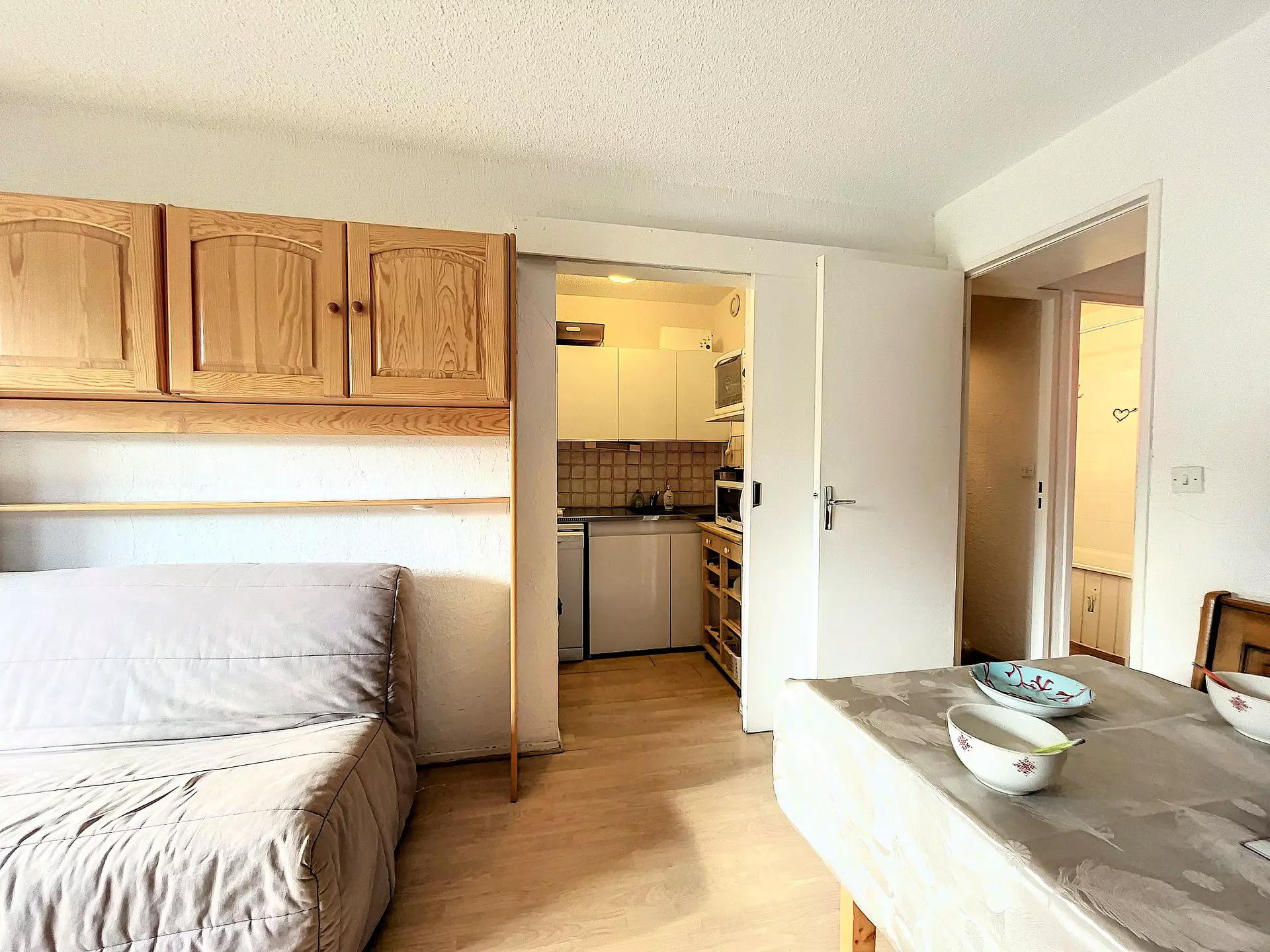 Studio bestehend aus einem Eingang, einer separaten Kabine mit 1 Einzelbett in der Höhe 80X190 und 1 Schlafsofa in 130X190 für 2 Personen sowie einem großen Abstellschrank