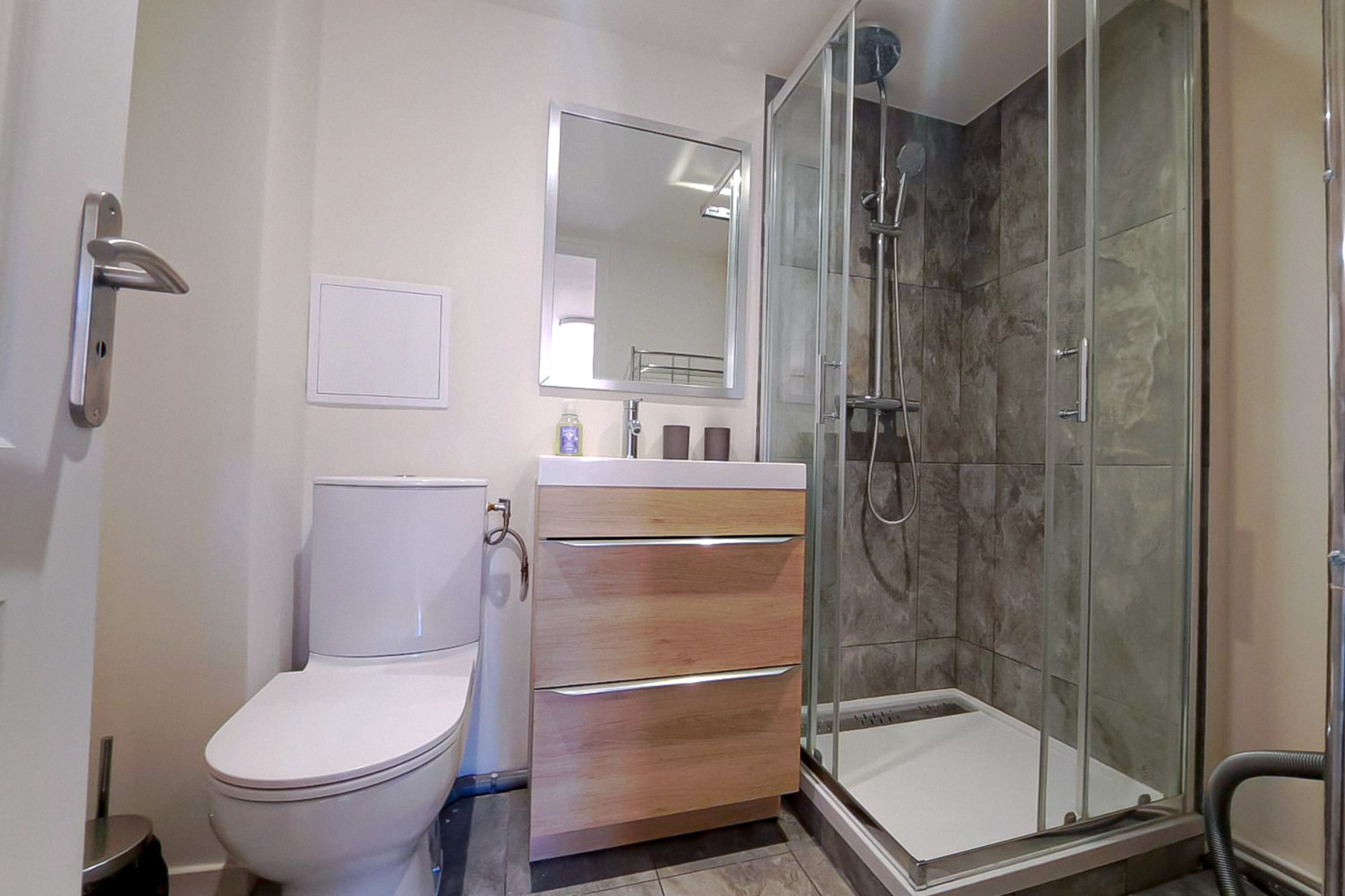 • BADEZIMMER: Bestehend aus einer Dusche, einer Einheit mit Waschbecken, Spiegel und WC