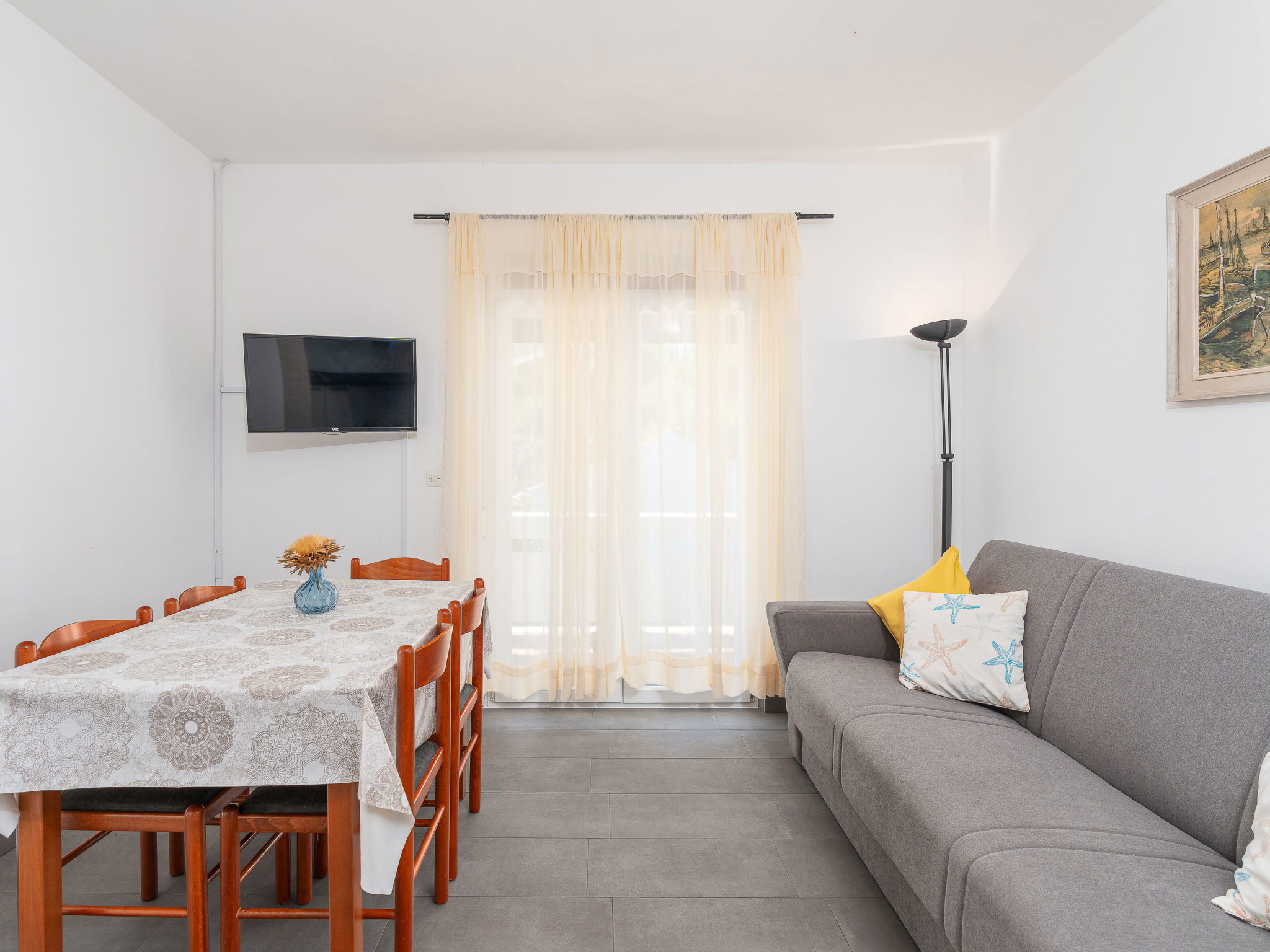3-Zimmer-Wohnung 60 m2 im 1. Stock. Wohn-/Esszimmer 20 m2 mit Sat-TV. Ausgang zur Terrasse. Eingang mit Klimaanlage. 1 Zimmer mit 1 Bett und 1 Doppelbett. Ausgang zum Balkon. 1 Zimmer mit 2 Betten. Ausgang zum Balkon. Offene Küche (4 Kochplatten, Backofen, Tiefkühler). Dusche/Bidet/WC. Klimaanlage (extra). Keine Heizmöglichkeit. Balkon 7 m2, Südlage, Terrasse überdacht. Terrassenmöbel. Schöne Sicht auf das Schwimmbad und den Garten. Zur Verfügung: Internet (WLAN, gratis). Maximal 1 Haustier/Hund erlaubt. Fernsicht zum Meer.